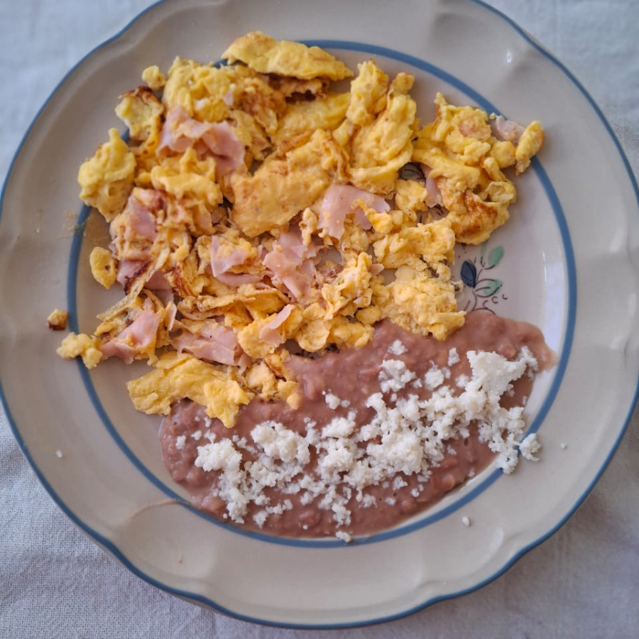 Lleva 2 huevos, jamón, frijoles, salsa y rebanadas de pan.