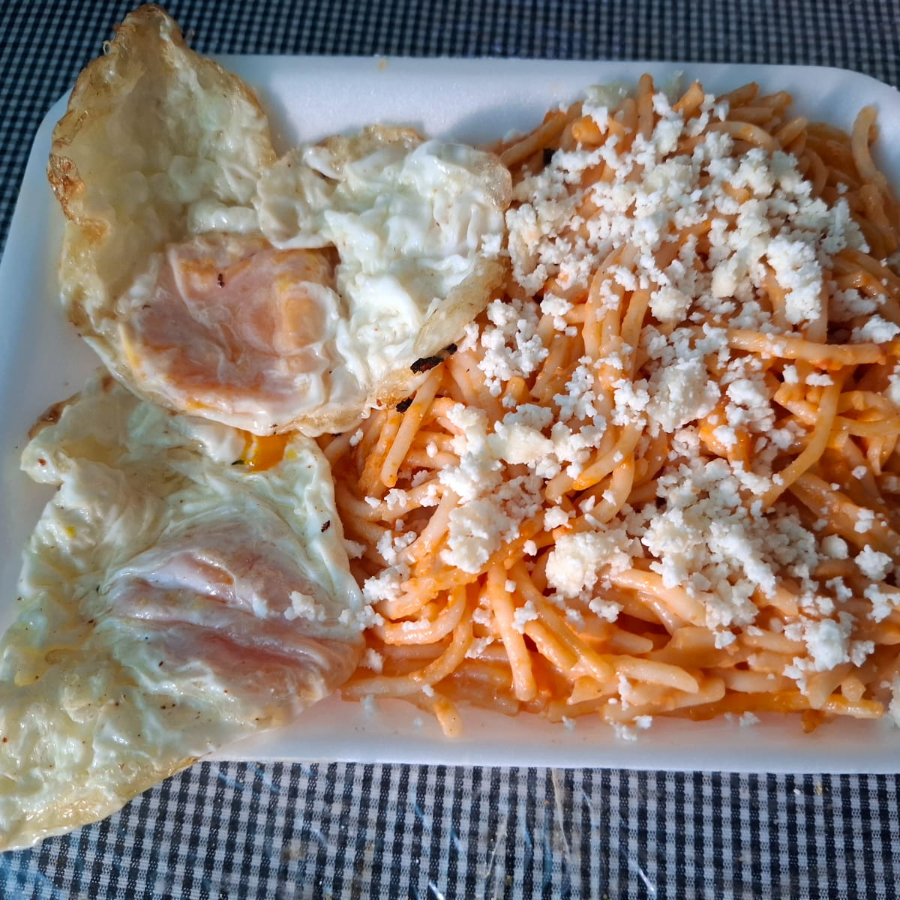 Lleva 2 huevos estrellados o revueltos , spaghetti, salsa y rebanadas de pan.