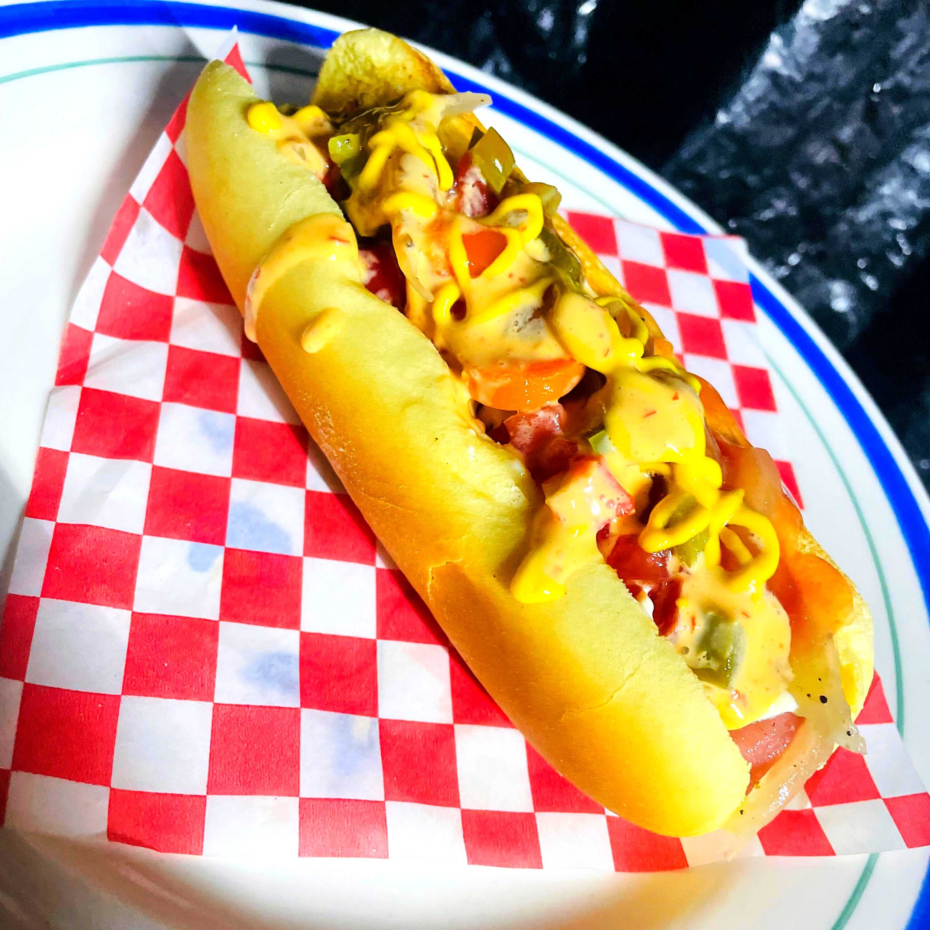 Pan Jumbo, Salchicha envuelta con tocino, Mayonesa, Jitomate, Cebolla caramelizada, Chiles en vinagre, Catsup, Mostaza, Ruffles, Chorizo y Queso Asadero