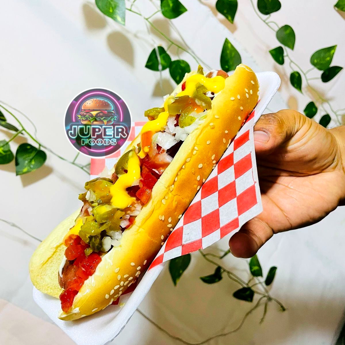 Pan Jumbo, Salchicha envuelta con tocino, Mayonesa, Jitomate, Cebolla caramelizada, Chiles en vinagre, Catsup, Mostaza, Ruffles, Jamón, Piña y Queso Asadero
