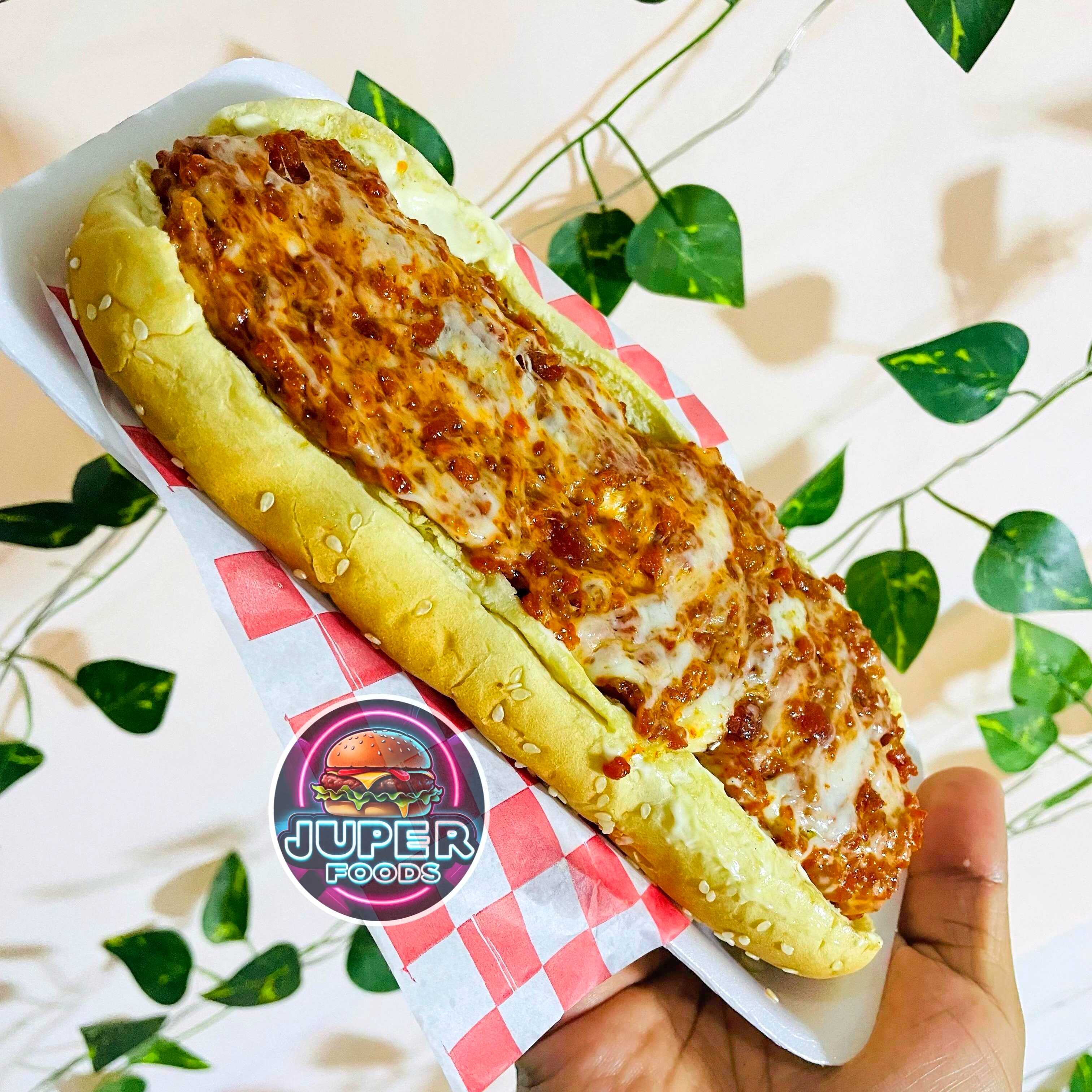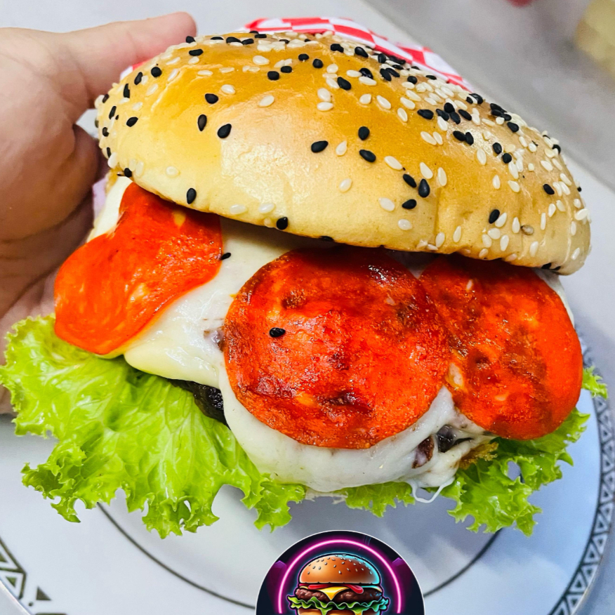 Pan parrillero, carne casera de res,lechuga,jitomate,cebolla caramelizada,catsup,chimichurri,chiles jalapeños,salsa de jitomate,queso manchego, queso asadero y peperonis.