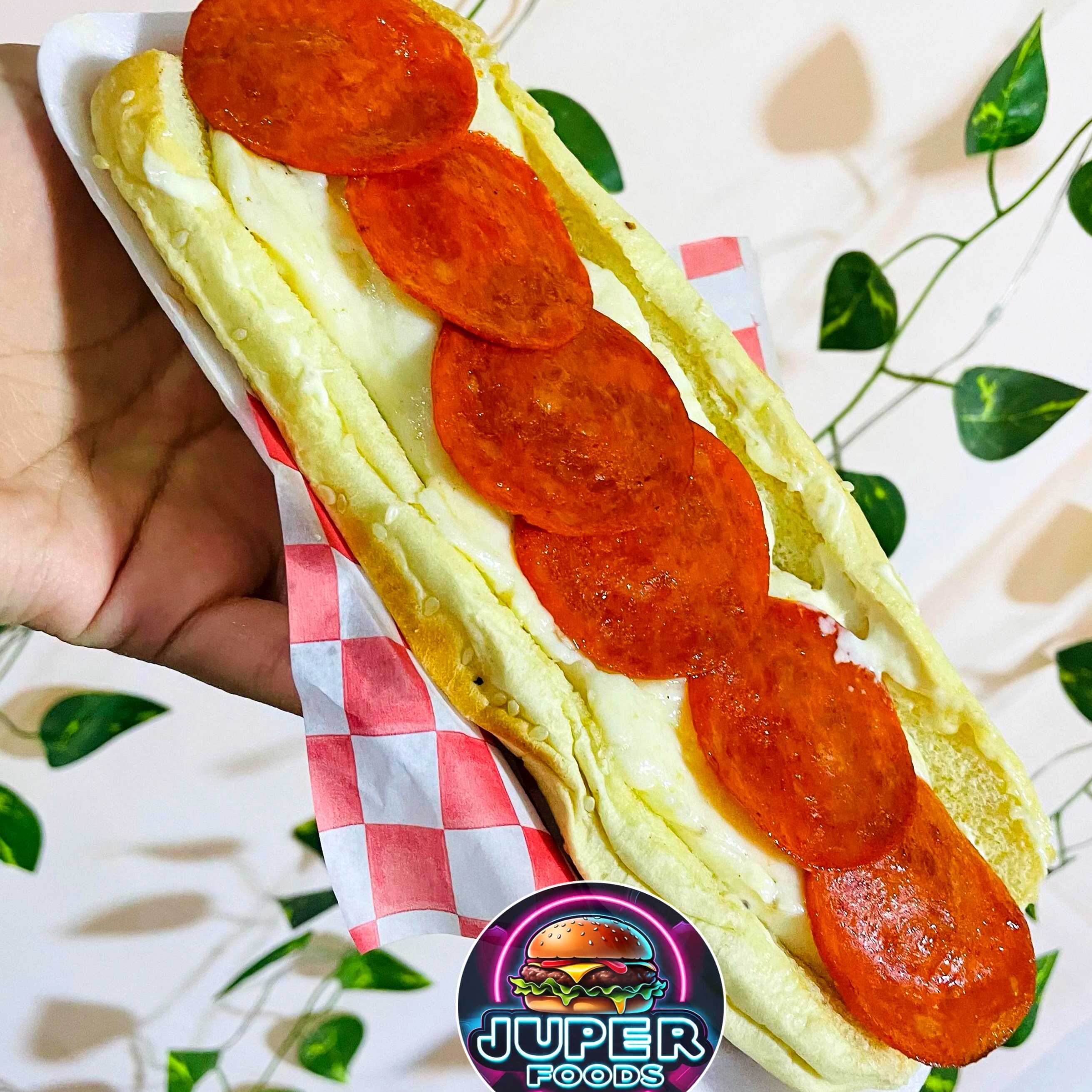 Pan Jumbo, Salchicha envuelta con tocino, Mayonesa, Jitomate, Cebolla caramelizada, Chiles en vinagre, Catsup, Mostaza, Ruffles, Queso Asadero y Pepperoni