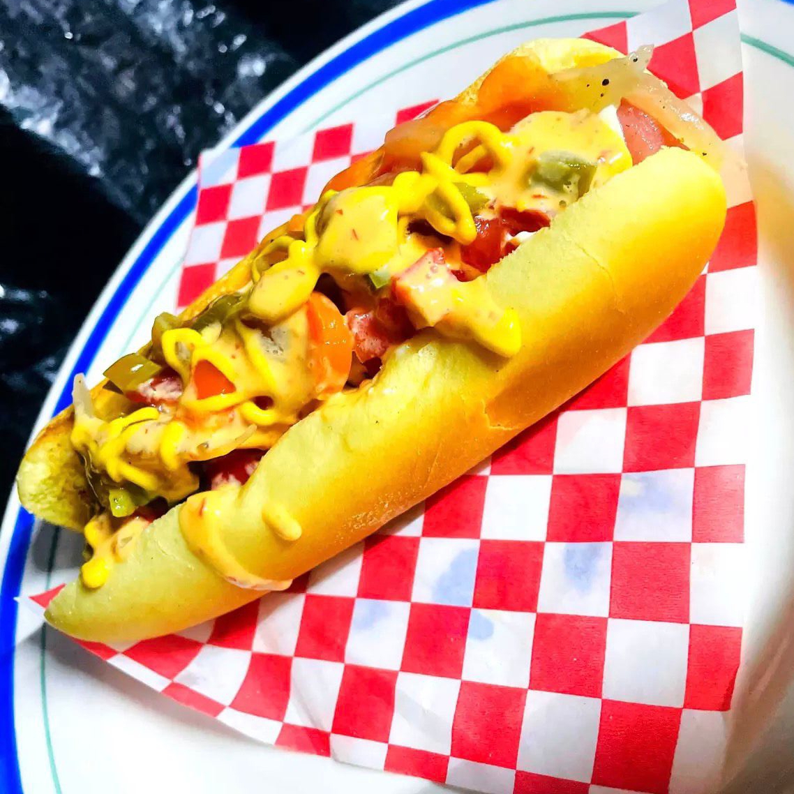 Pan, Salchicha, Mayonesa, Jitomate, Cebolla caramelizada, Chiles en vinagre, Catsup y Mostaza