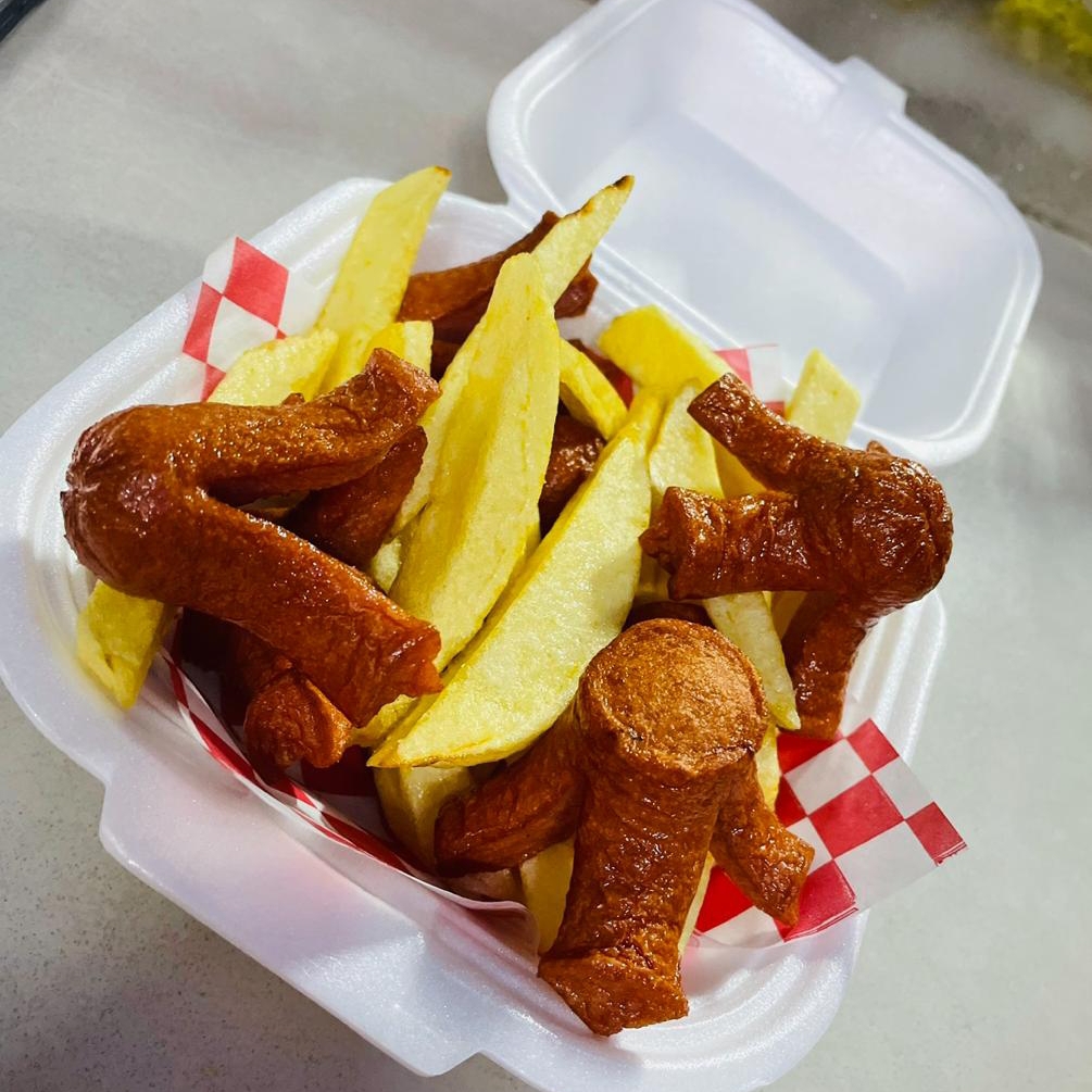 Salchipulpos con papas a la francesa acompañado con los aderezos que gustes entre Catsup, Chimichurri o Búfalo, adicionales(limon y tenedor)