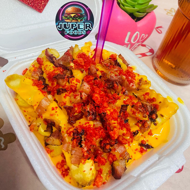 Deliciosas papas fritas bañadas en queso amarillo con tocino doradito y un topping a elegir de Cheetos flamin` hot o Ruffles (favor de enviar msj con el topping que se escoja)