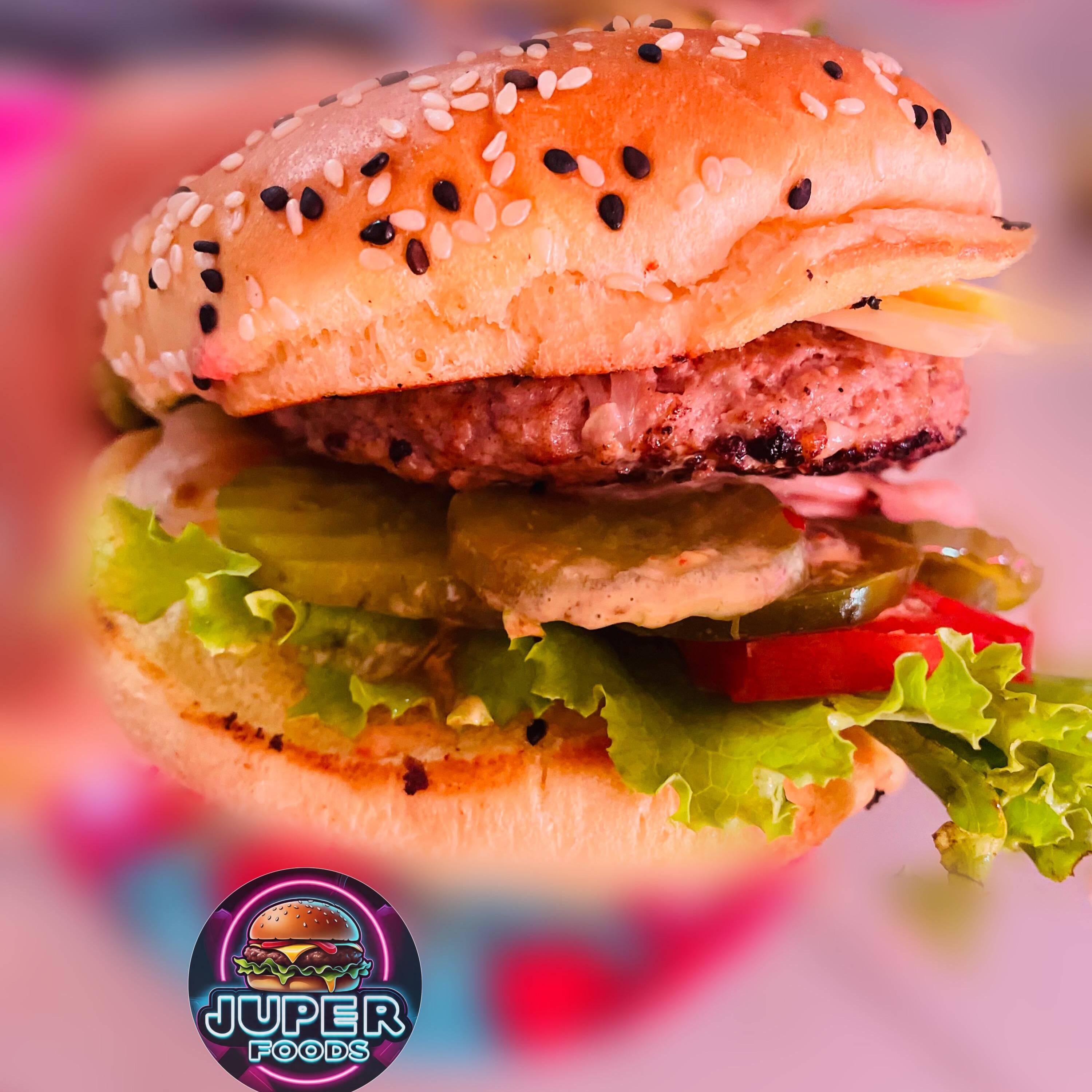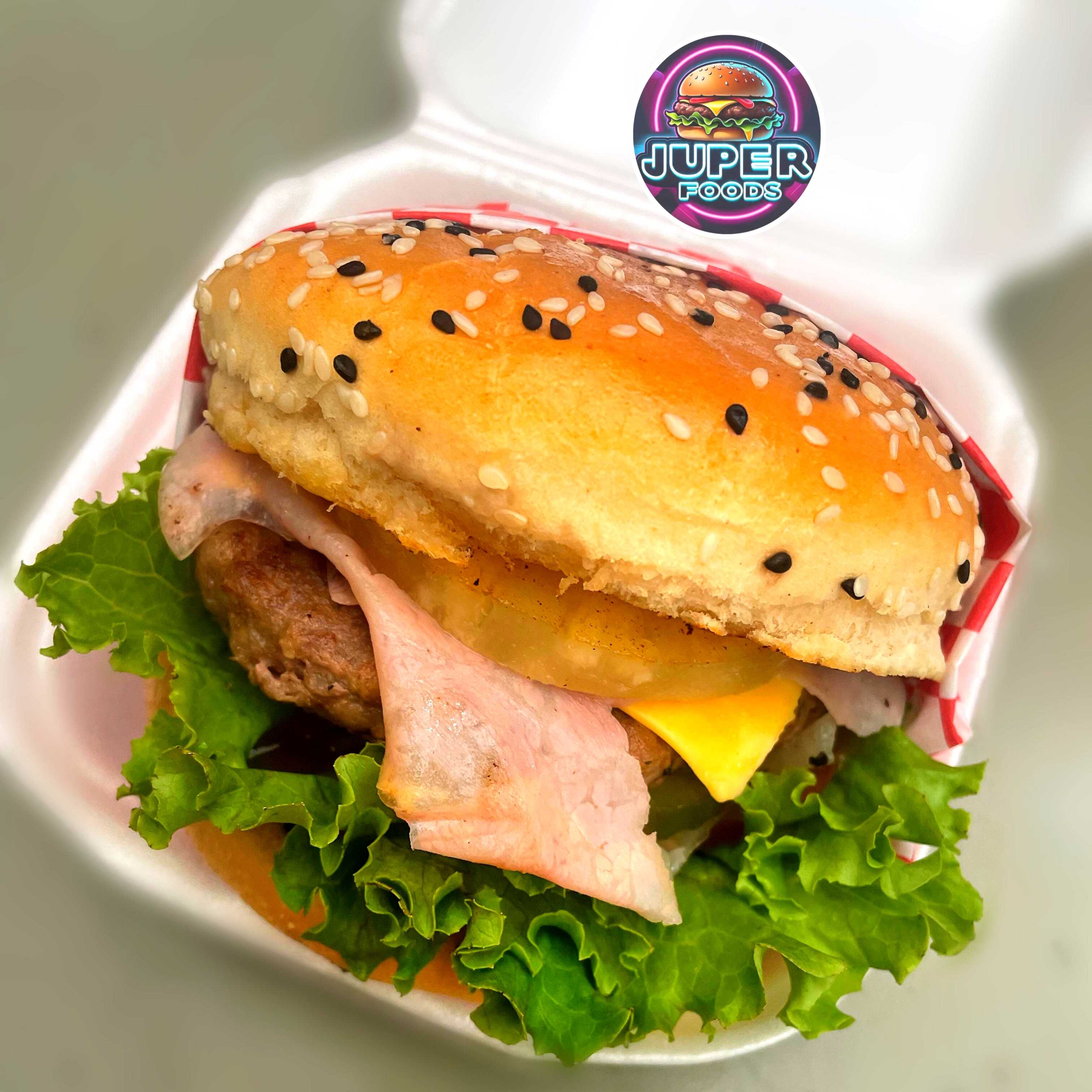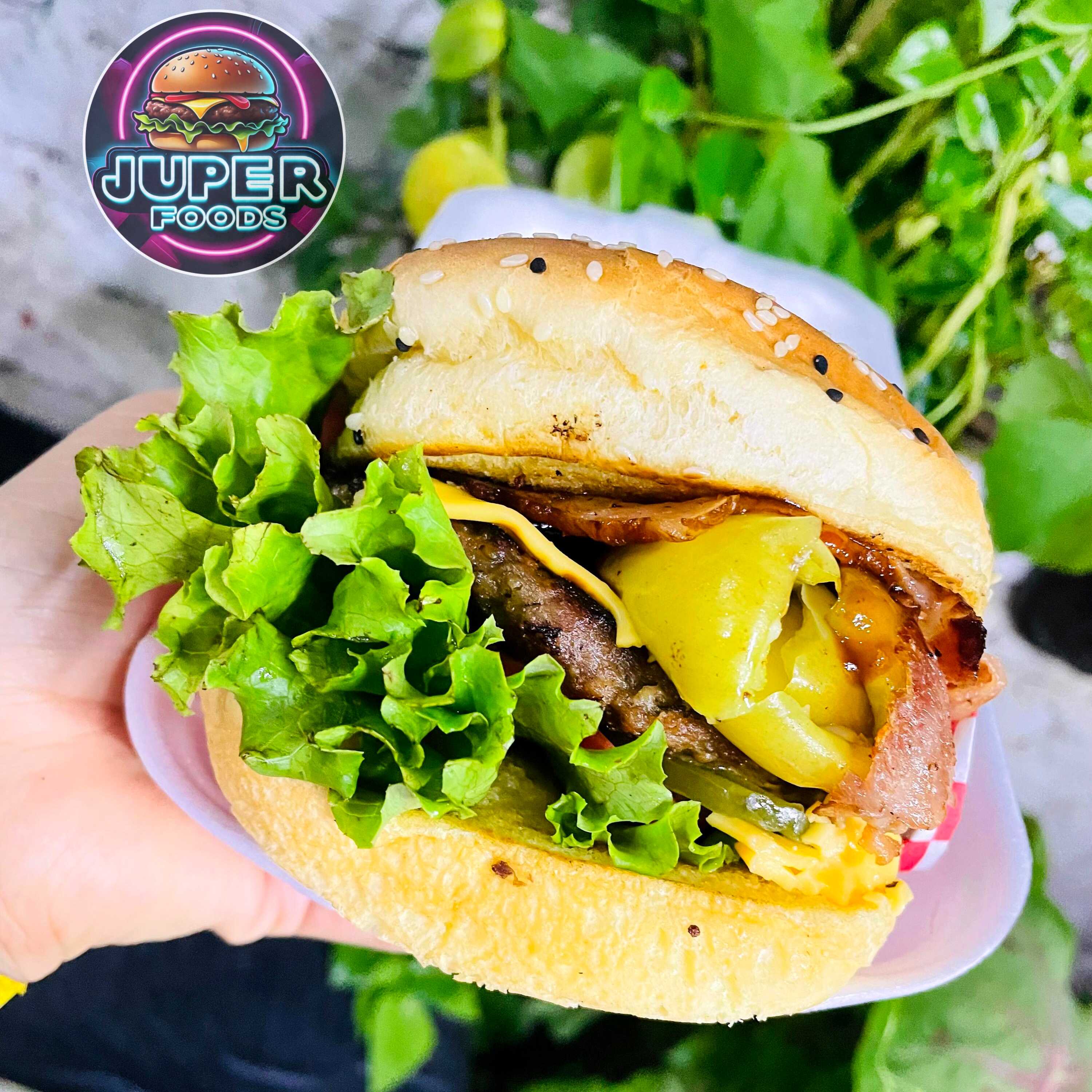 Deliciosa hamburguesa de pan parrillero, carne de res, queso manchego, lechuga,jitomate, cebolla caramelizada, chiles en vinagre,catsup, chimichurri, pepinillos, bañada en queso amarillo con topping de tocino y chettos flaming hot o ruffles a elegir (favor de enviar msj con el topping elegido)
