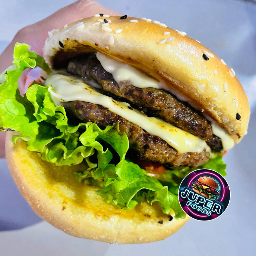 Pan parrillero, mayonesa, lechuga, jitomate, cebolla caramelizada, pepinillos, catsup, chimichurri, doble carne y doble queso manchego.
