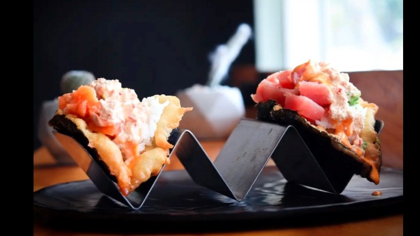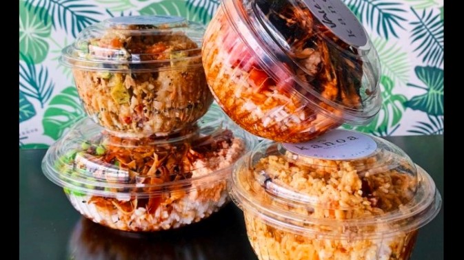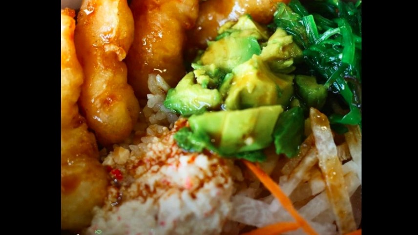 Base de arroz de coliflor mezclado con pepino, jícama y salsa volcano. Con proteína de pollo y tocino, acompañado de queso crema, aguacate y Tampico, con ajonjolí tostado y salsa spicy ponzu