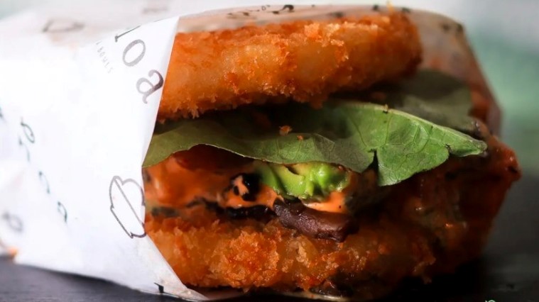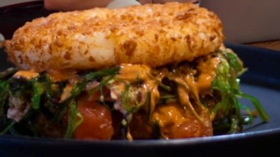 Hamburguesa de atún (sazonado con salsa picante), acompañada de lechuga, aguacate, champiñones caramelizados y ajonjolí mixto, con aderezo Kanoa especial y salsa Volcano.