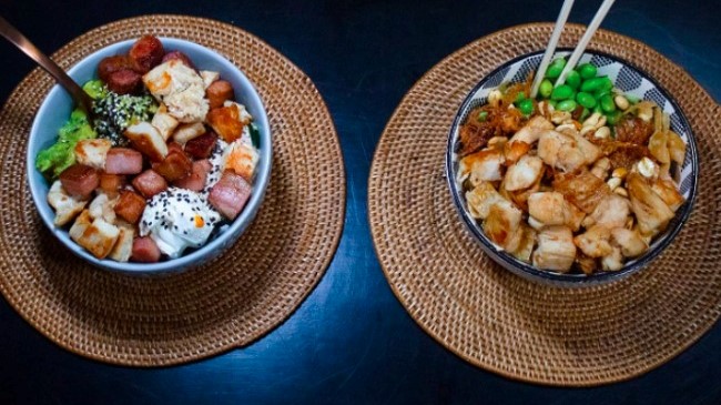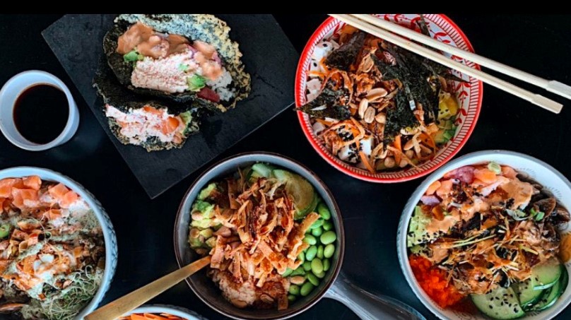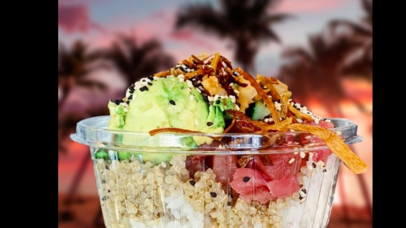 Base de arroz de coliflor mezclado con pepino, jícama y salsa volcano. Con proteína de pollo y tocino, acompañado de queso crema, aguacate y Tampico, con ajonjolí tostado y salsa spicy ponzu.