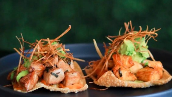 Hamburguesa de salmón, acompañada de salsa tampico, seaweed salad y pepino, con aderezo de chipotle y teriyaki.