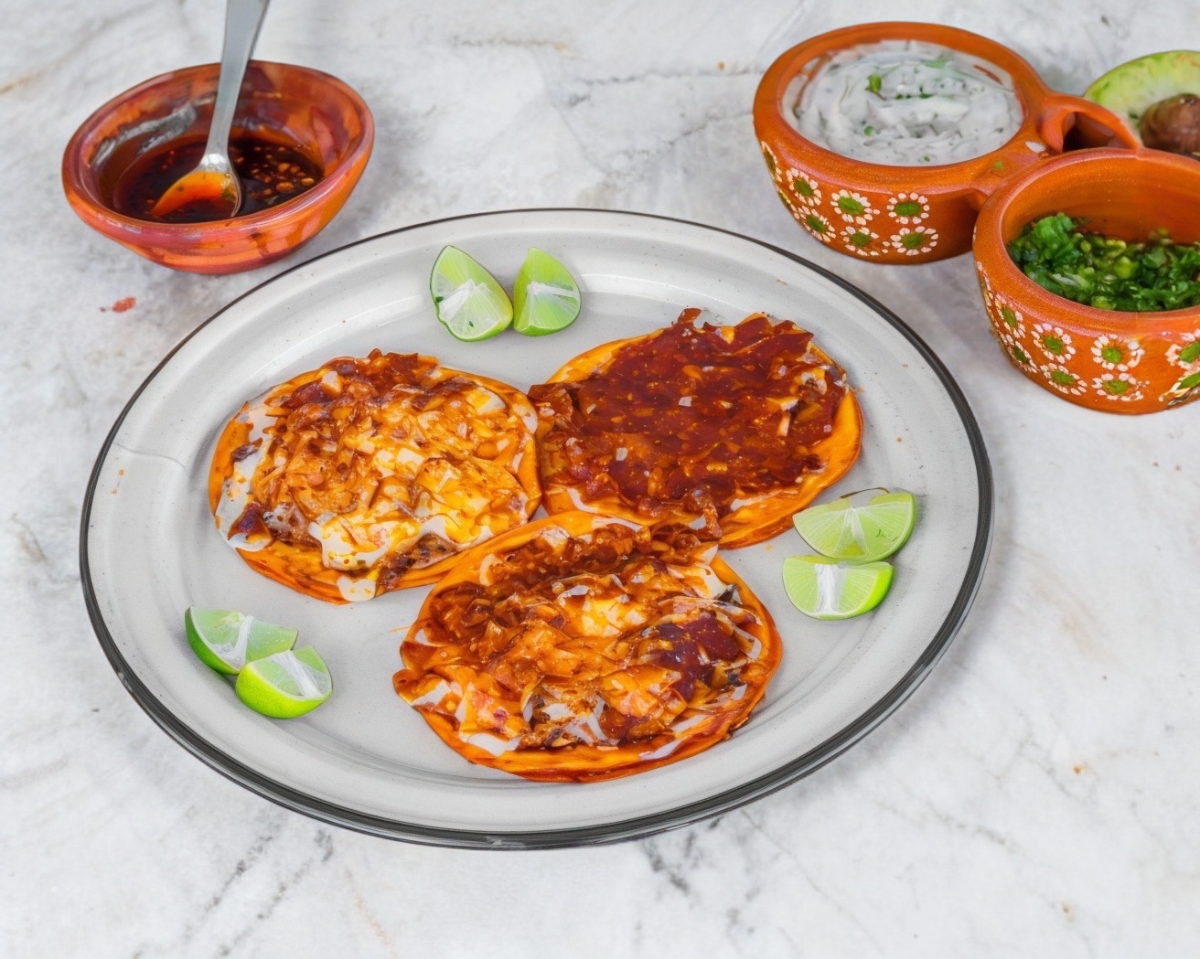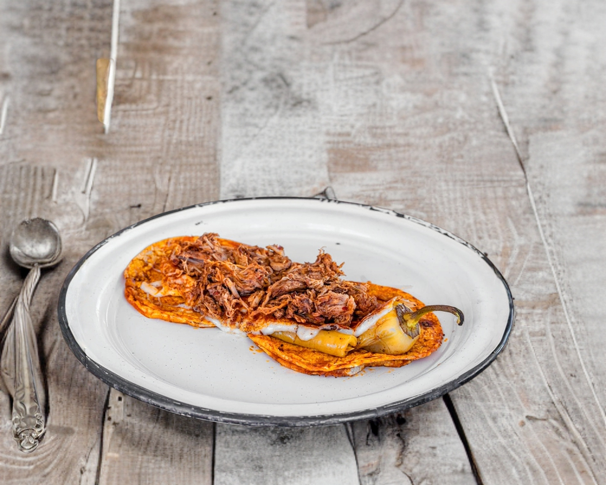 Chile húngaro sobre dos tortillas, con queso asadero y barbacoa.