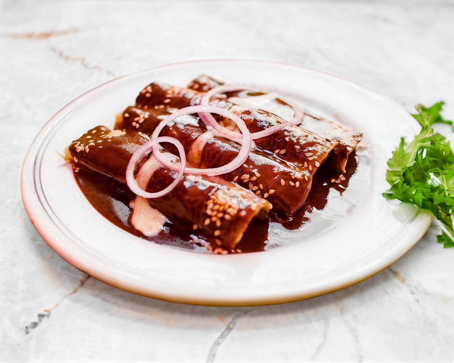 4 Piezas de tortillas pasadas en aceite rellenas de pollo bañadas en mole casero, cubiertas de queso con ensalada.