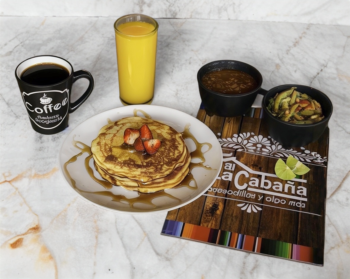 1 Piezas de hot cakes caseros, acompañados de mermelada, chocolate liquido y mantequilla.