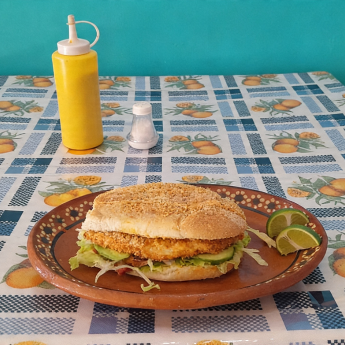 Milanesa de pollo, lechuga, jitomate, aguacate y cebolla