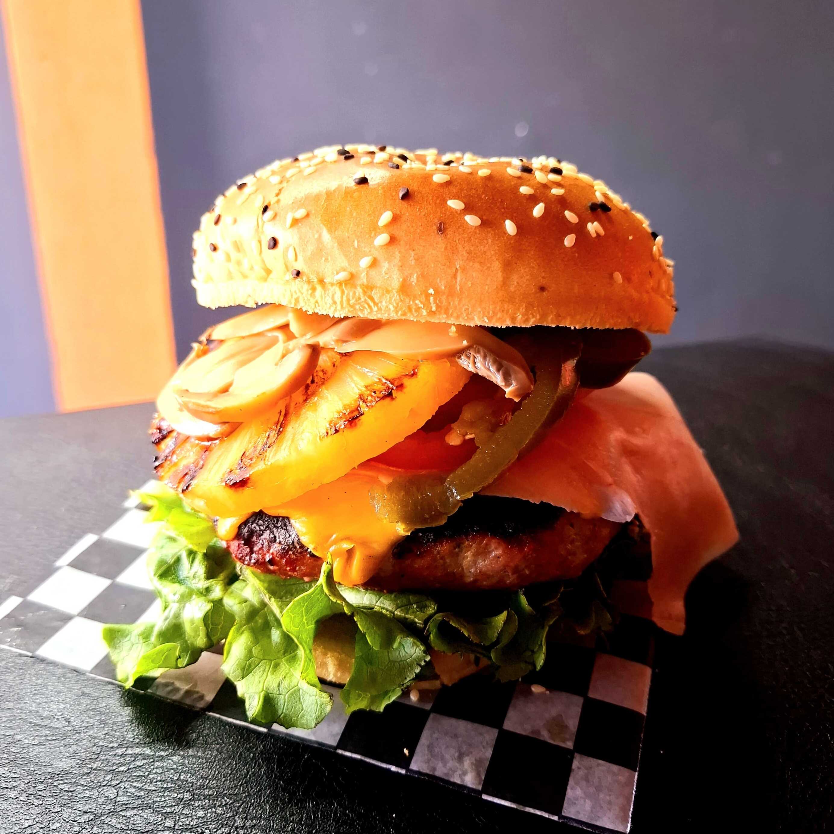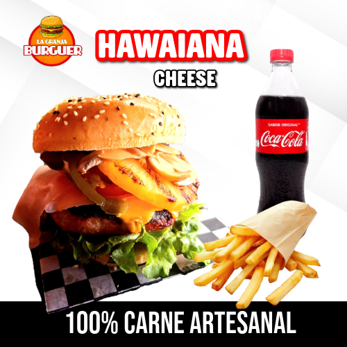 Hamburguesa a la parrilla Hawaiana con papas y refresco