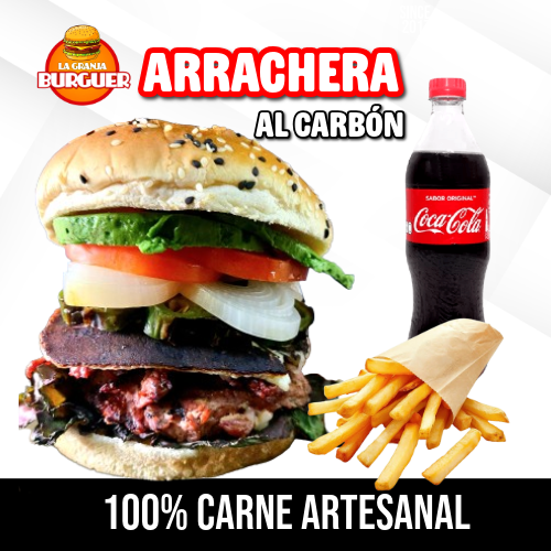 150 Gramos de arrachera asada al carbón , fileteada y puesta en Hamburguesa gratinada con asadero + cebollitas asadas + chiles asados + Vegetales ( lechuga fresca , jitomate , aguacate ) + Aderezo de la Casa.