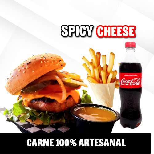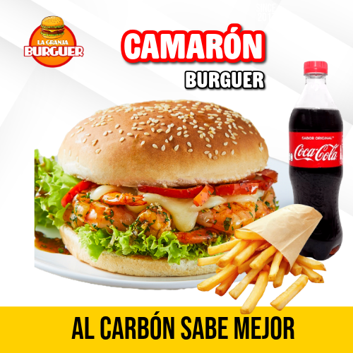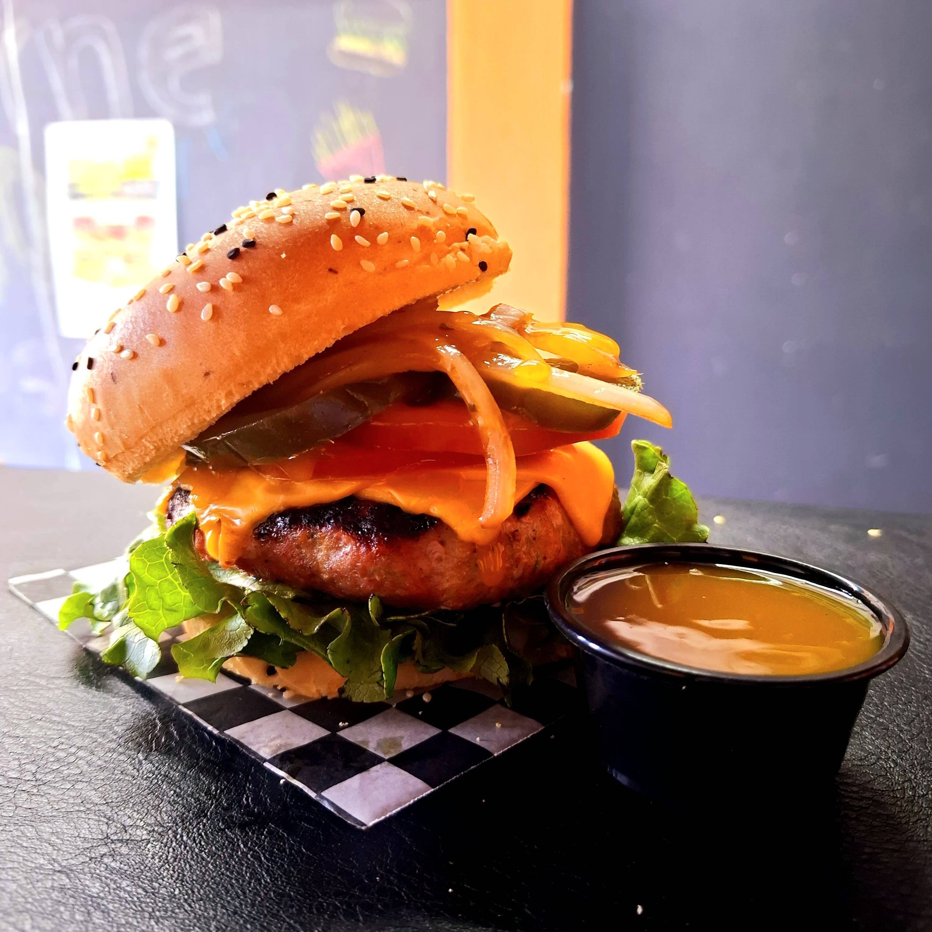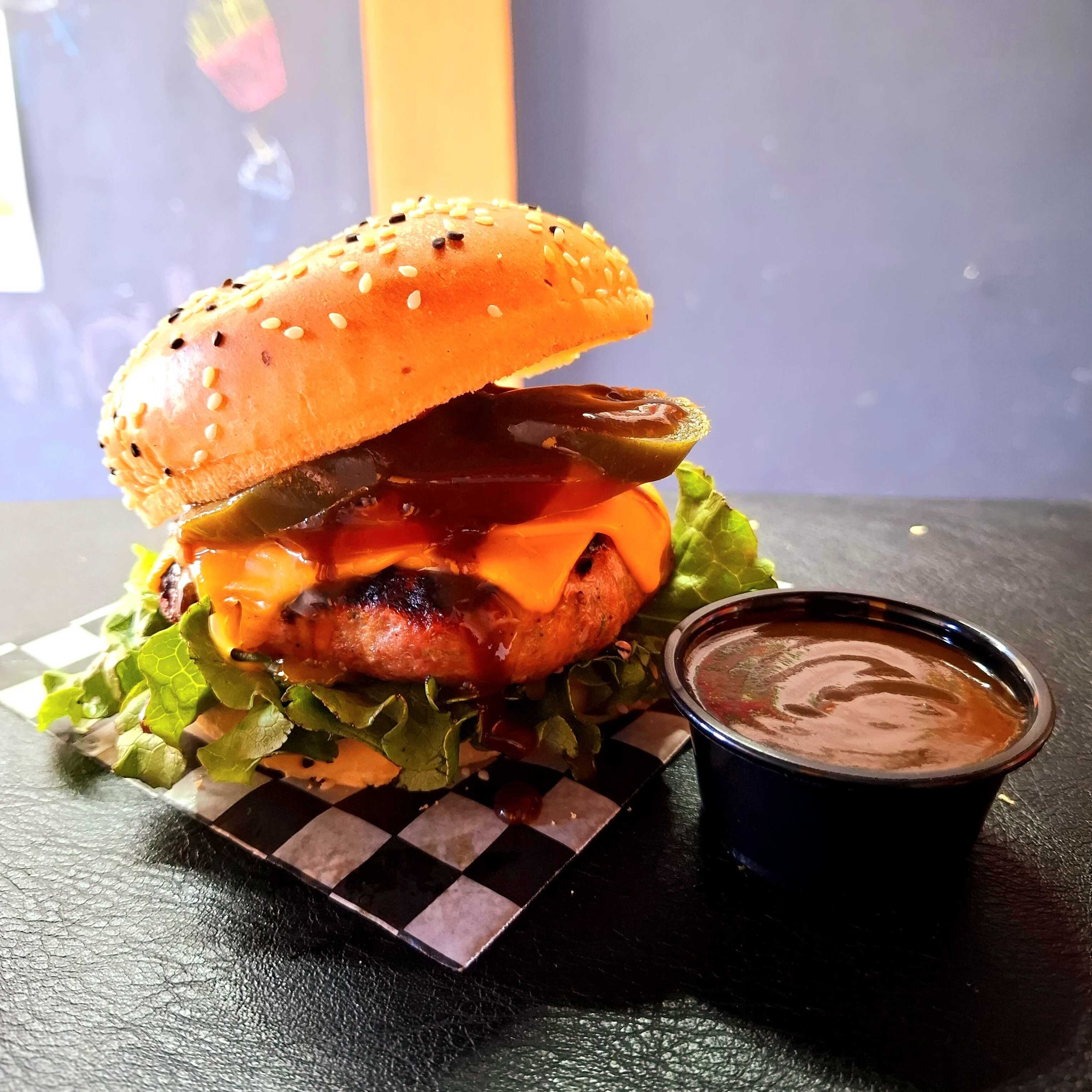 Hamburguesa de res bañada con salsa mango-habanero, con papas y refresco