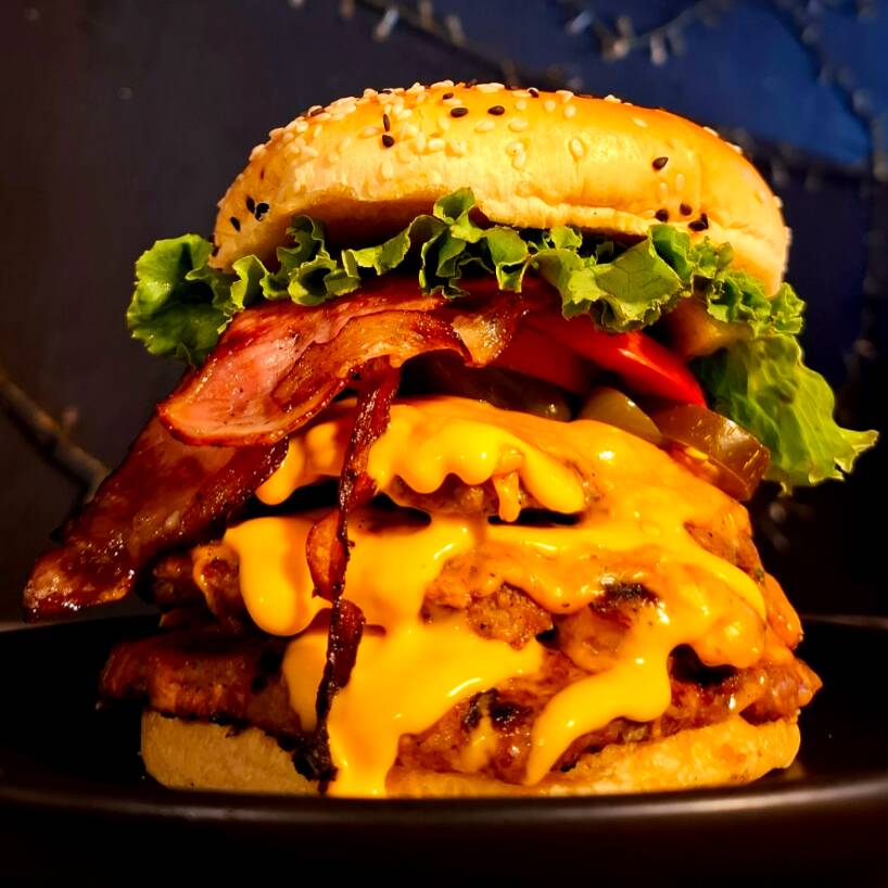 Doble carne de res de 140 gramos cada una, asada a la parrilla, doble queso amarillo, vegetales Frescos ( Tomate recién rebanado, Chile en rodajas con vinagre, lechuga fresca ) + catsup + mayonesa