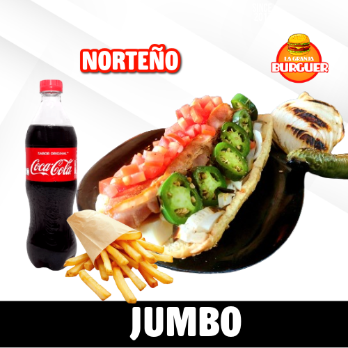 Salchicha jumbo asada al carbón, tocino, vegetales frescos ( jitomate , cebolla , chiles ), aderezos ( catsup, mostaza y mayonesa ) y refresco 400 ml.