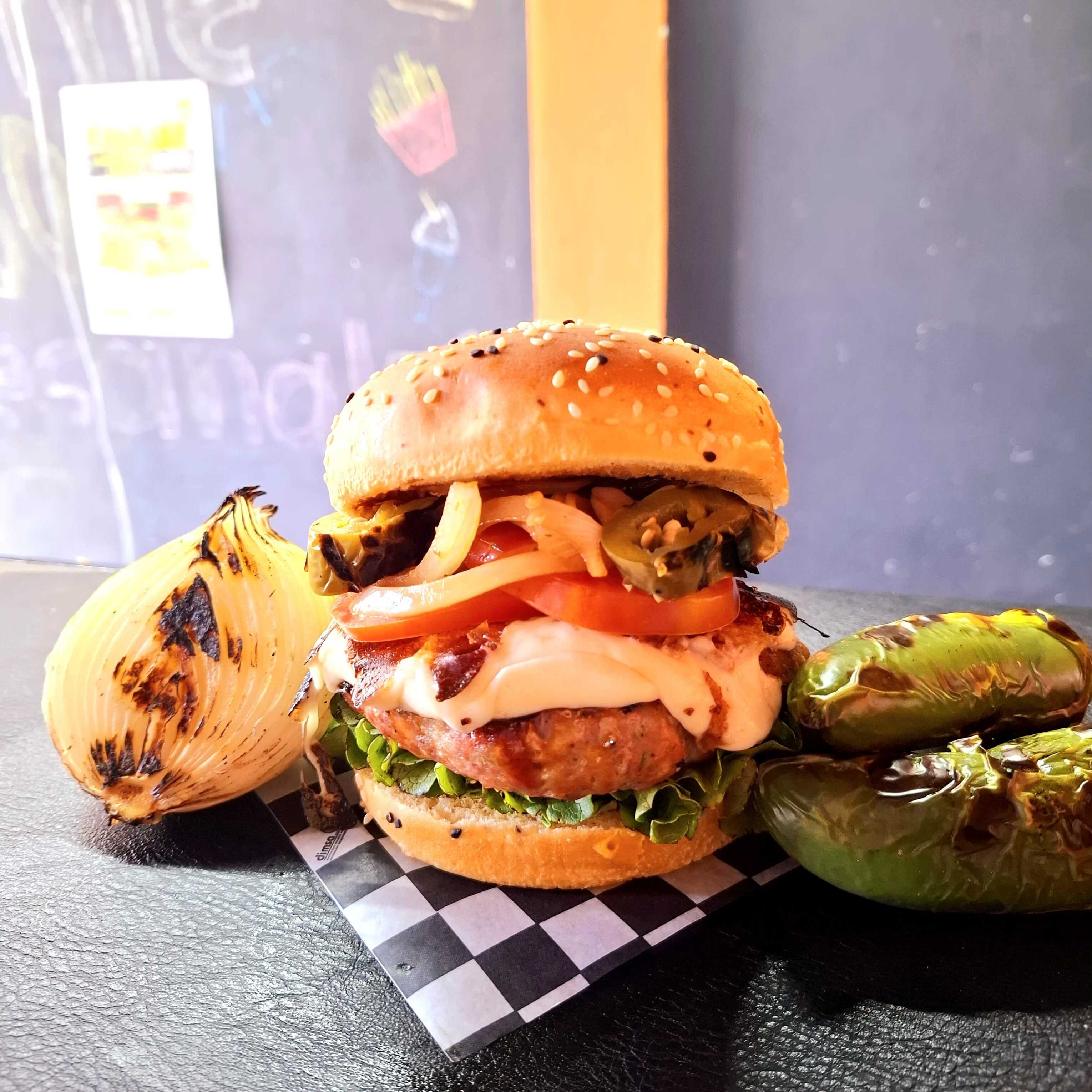 220 Gramos de carne de res asada a la parrilla y rellena de queso blanco + Queso amarillo + Tocino + Vegetales Frescos ( tomate recién rebanado, lechuga fresca , Chile jalapeño en rodajas y vinagre, aguacate ) + Aderezos ( catsup, mostaza , Mayonesa )
