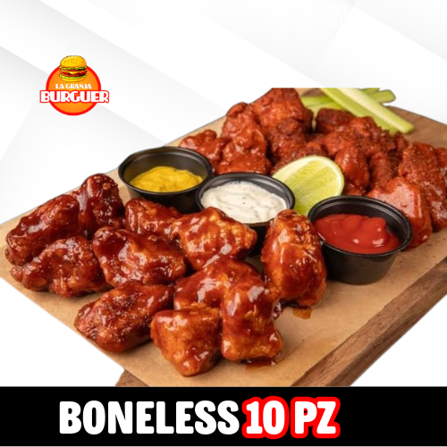 10 pz boneless, 1 orden de papas, 8 aros de cebolla, 6 Nuggets de pollo, 1 tiras de pollo, salsa BBQ, queso cheddar y aderezo ranch