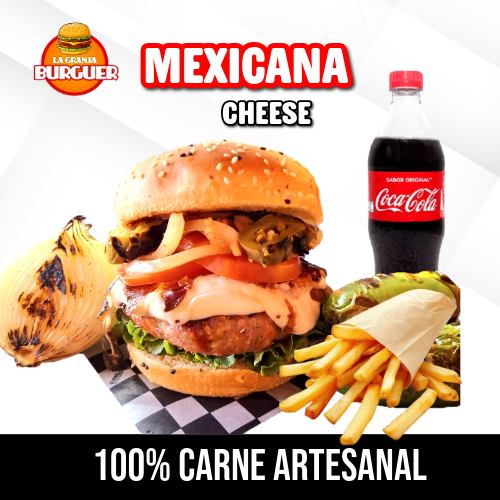 140 Gramos de carne asada a la parrilla, cubierta de queso blanco gratinado + cebollitas asadas + Chiles toreados + Vegetales frescos ( Tomate recién rebanado, lechuga fresca) + Catsup + Mayonesa + Refresco 400 ml.