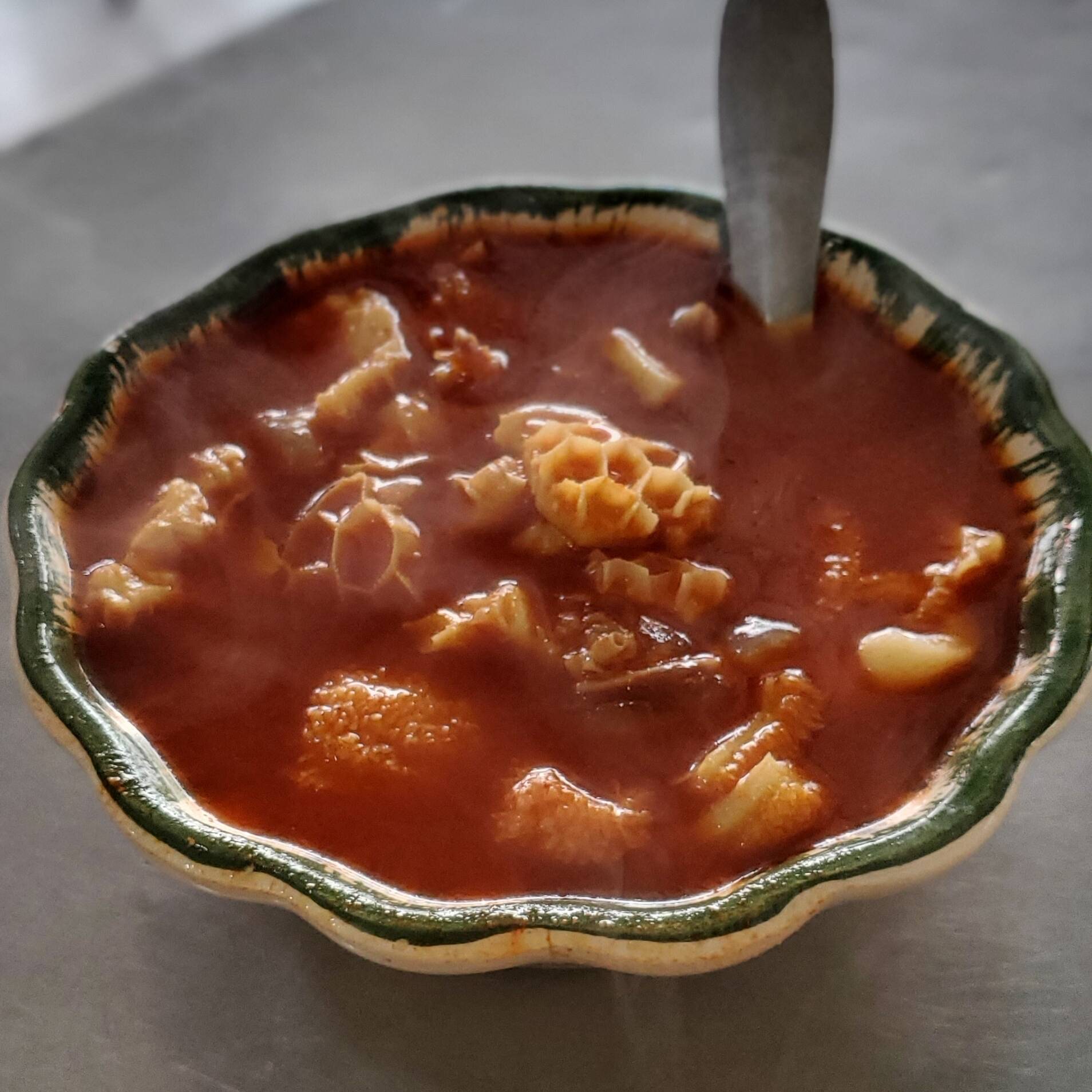 Porcion personal: Menudo de res, acompañado de tortillas hechas a mano, cebolla, limón, oregano y chile en polvo.