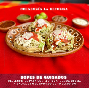Rellenas de carne deshebrada de cerdo o pollo con lechuga, crema, queso y salsa.