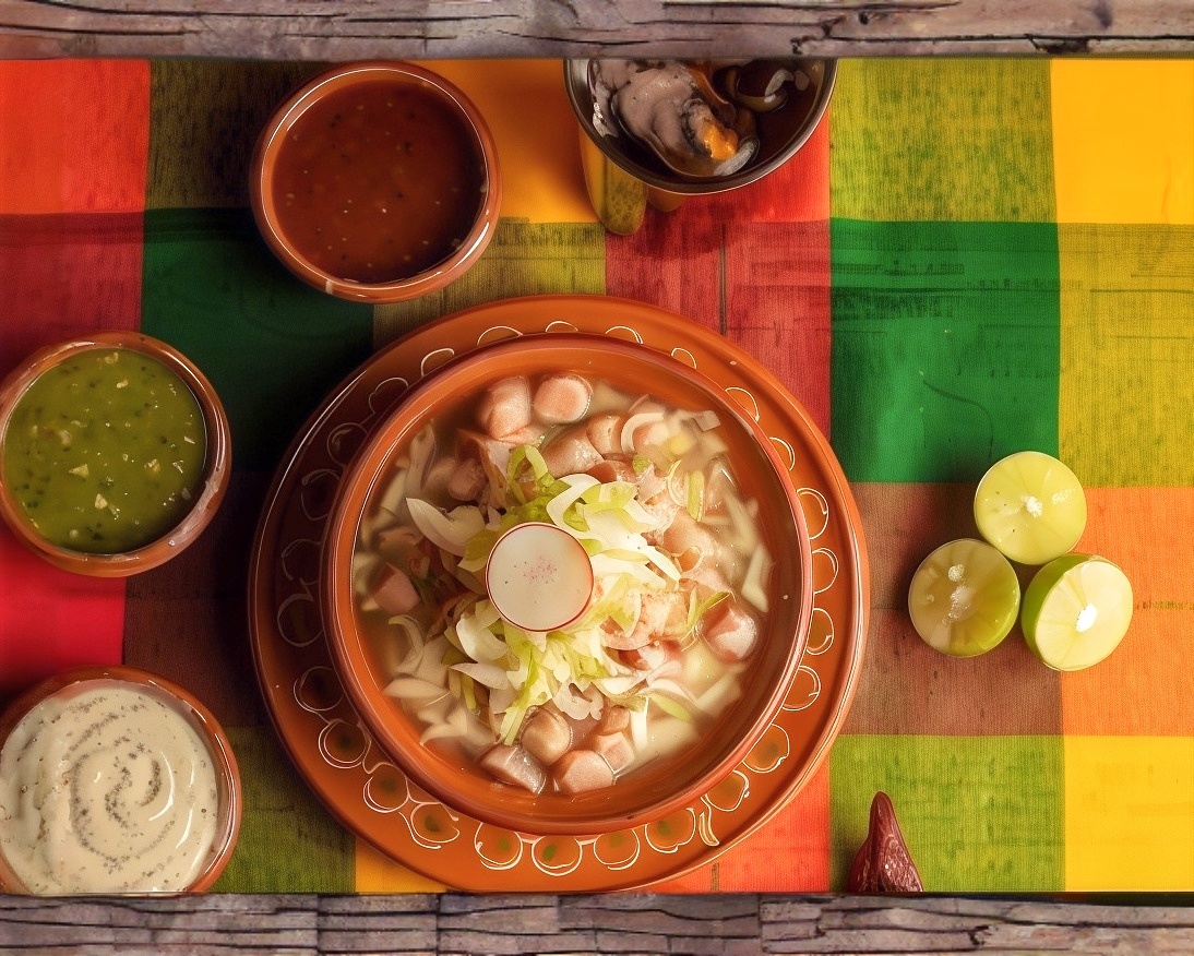 radicional pozole a elegir rojo con carne de puerco y blanco con carne de pollo acompañado de lechuga, cebolla, rábanos, orégano, limones y tostadas. 1 litro.
