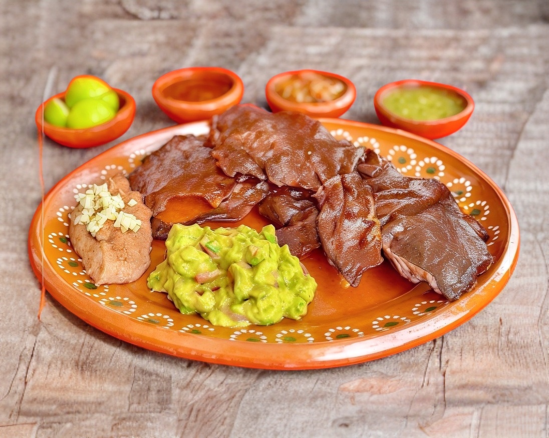 Guisado a elegir con frijoles, lechuga, crema, queso y salsa.