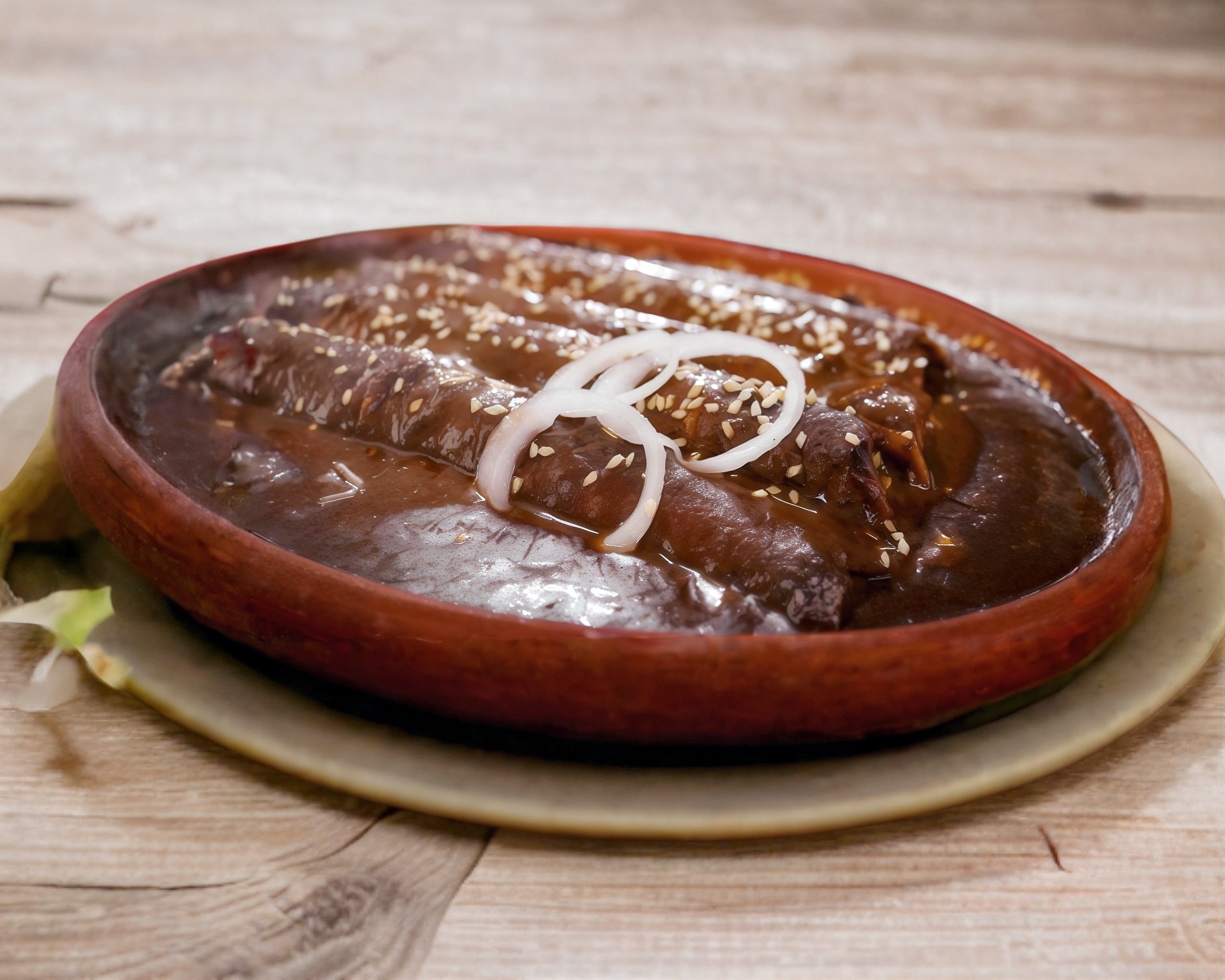 Rellenas de pollo bañadas en nuestro rico mole especialidad de la casa con ajonjolí.