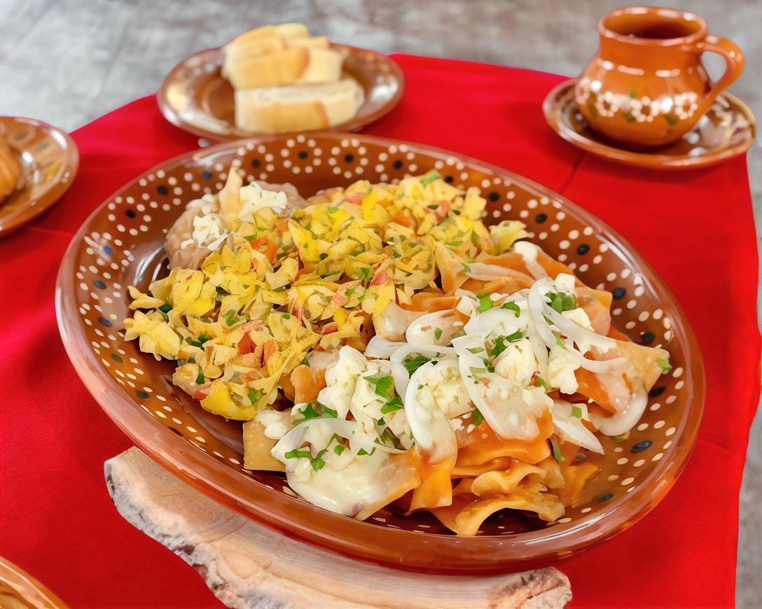 Tradicionales y crujientes totopos bañados en salsa de la casa roja, verde o molcajeteada, con queso, crema y cebolla acompañados de frijoles.
