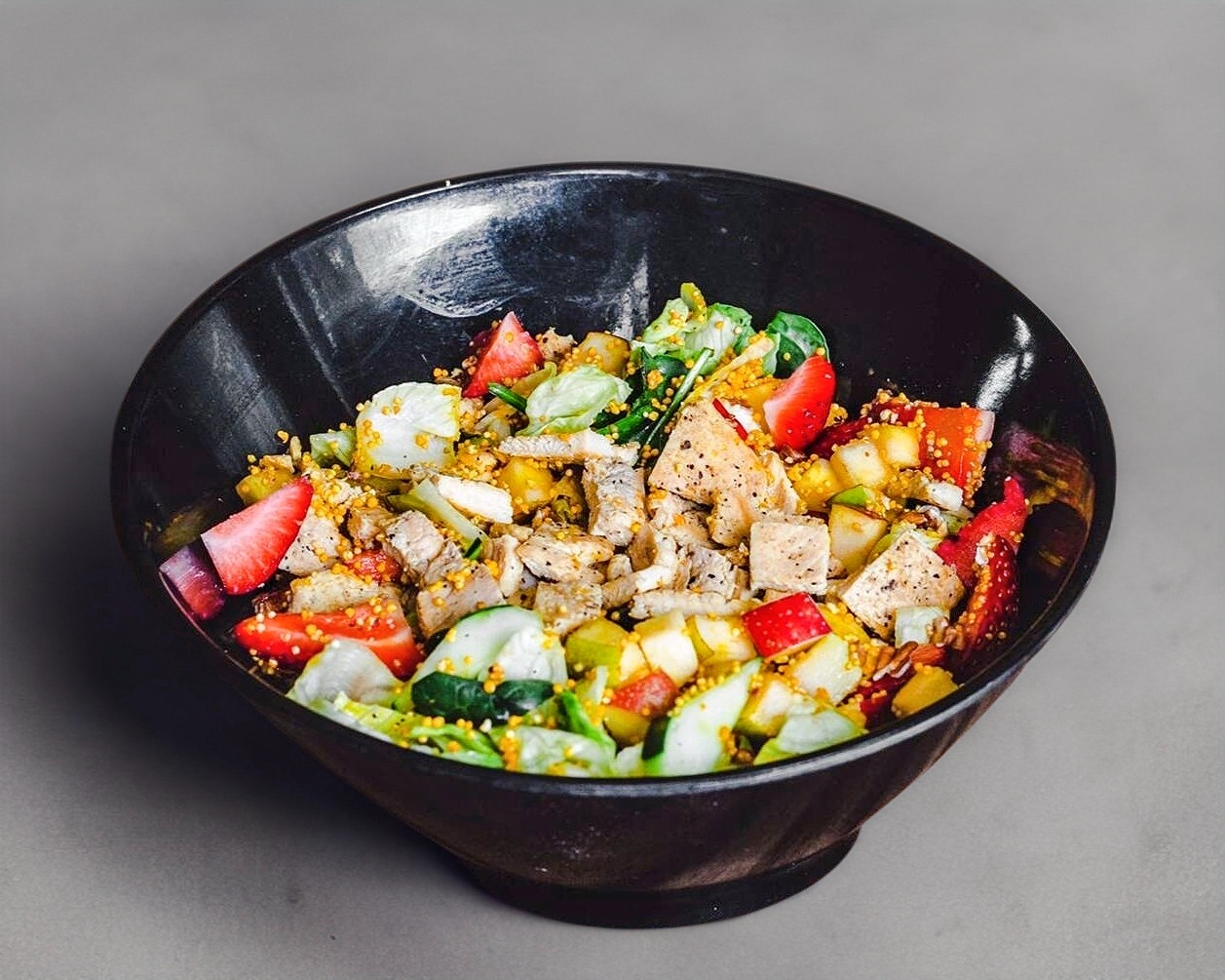 Mix de lechuga y espinaca, pera, manzana, pepino, fresa, nuez, ajonjoli garapiñado con pechuga de pollo a la plancha.