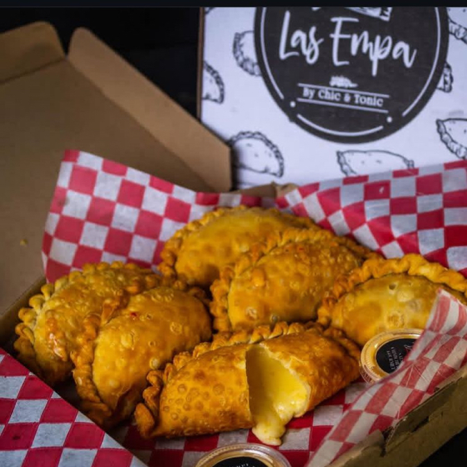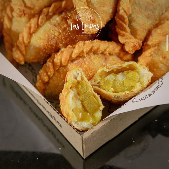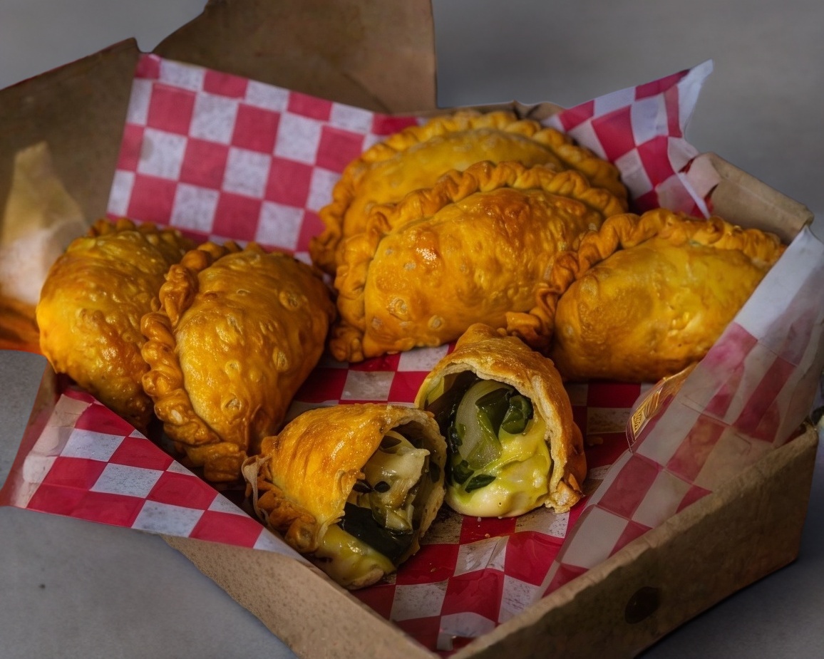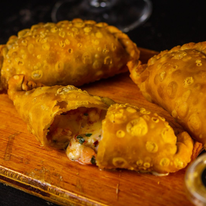 Empanada rellena de camarón, mantequilla, perejil y queso.