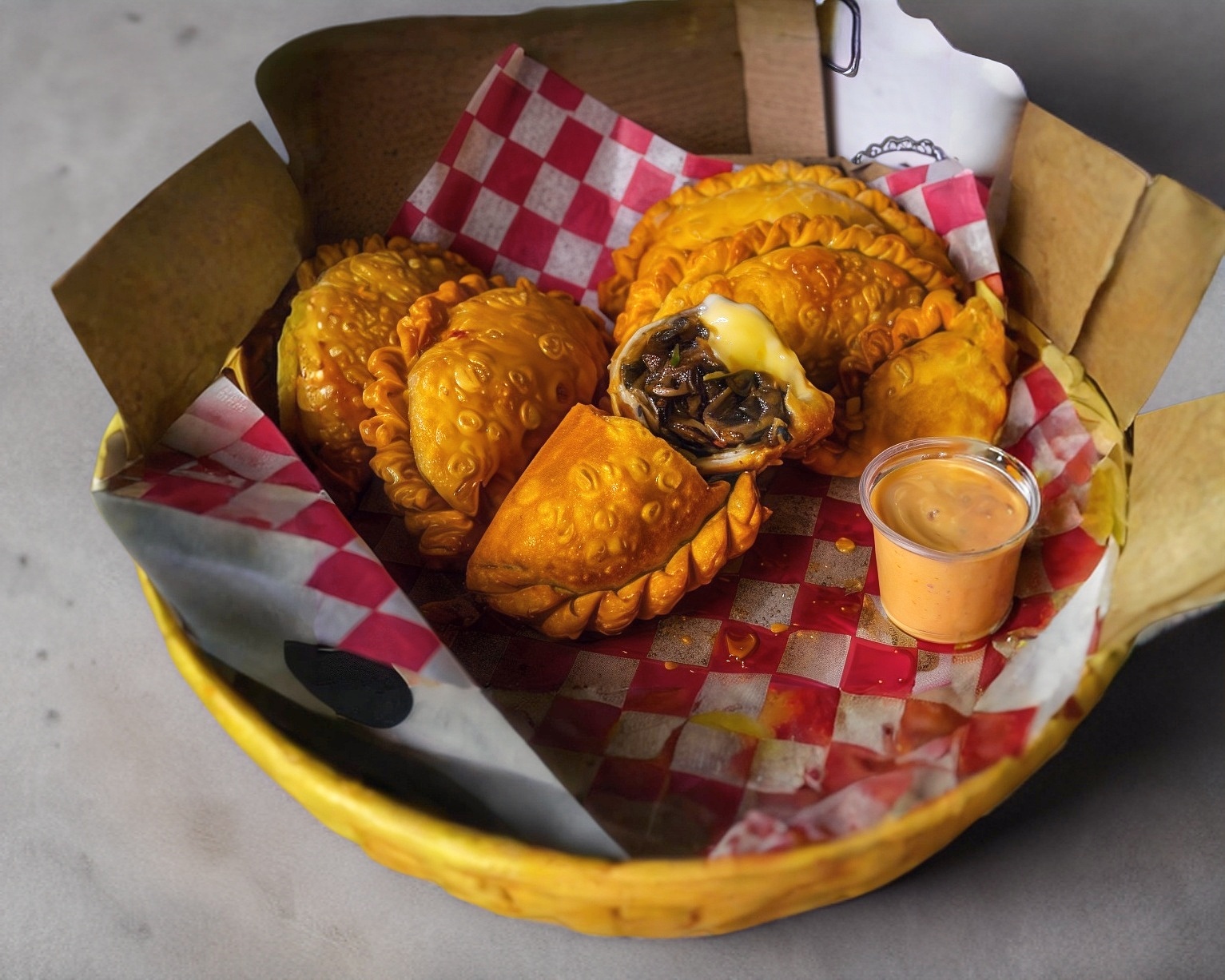 Empanada rellena de champiñones al ajillo y queso asadero