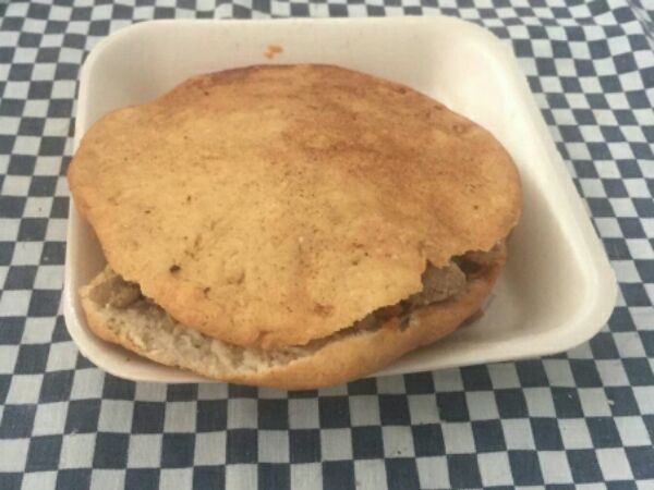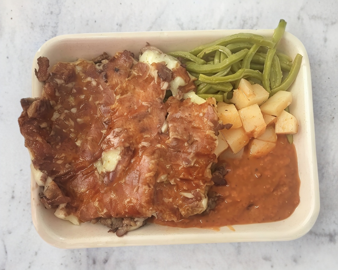 Carne, cebolla frita, jitomate, queso asadero, lechuga. Todos los vegetales van aparte