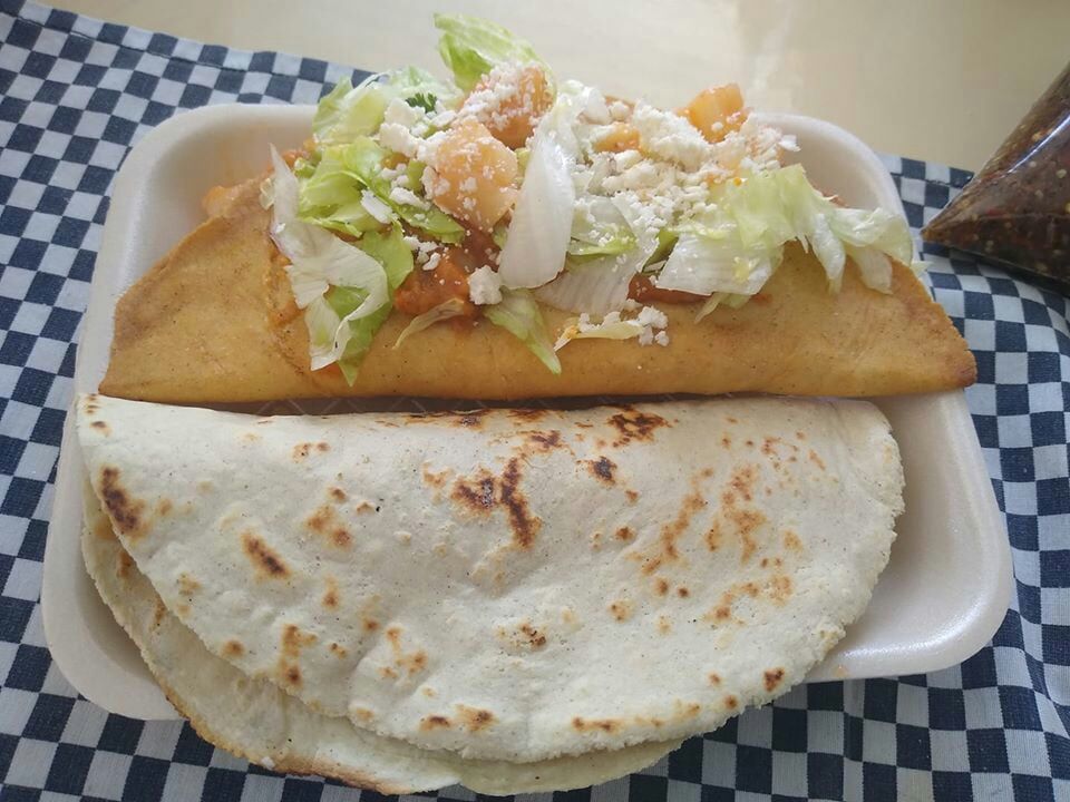 camaron, cebolla frita, jitomate, queso asadero, lechuga todos los vegetales van aparte