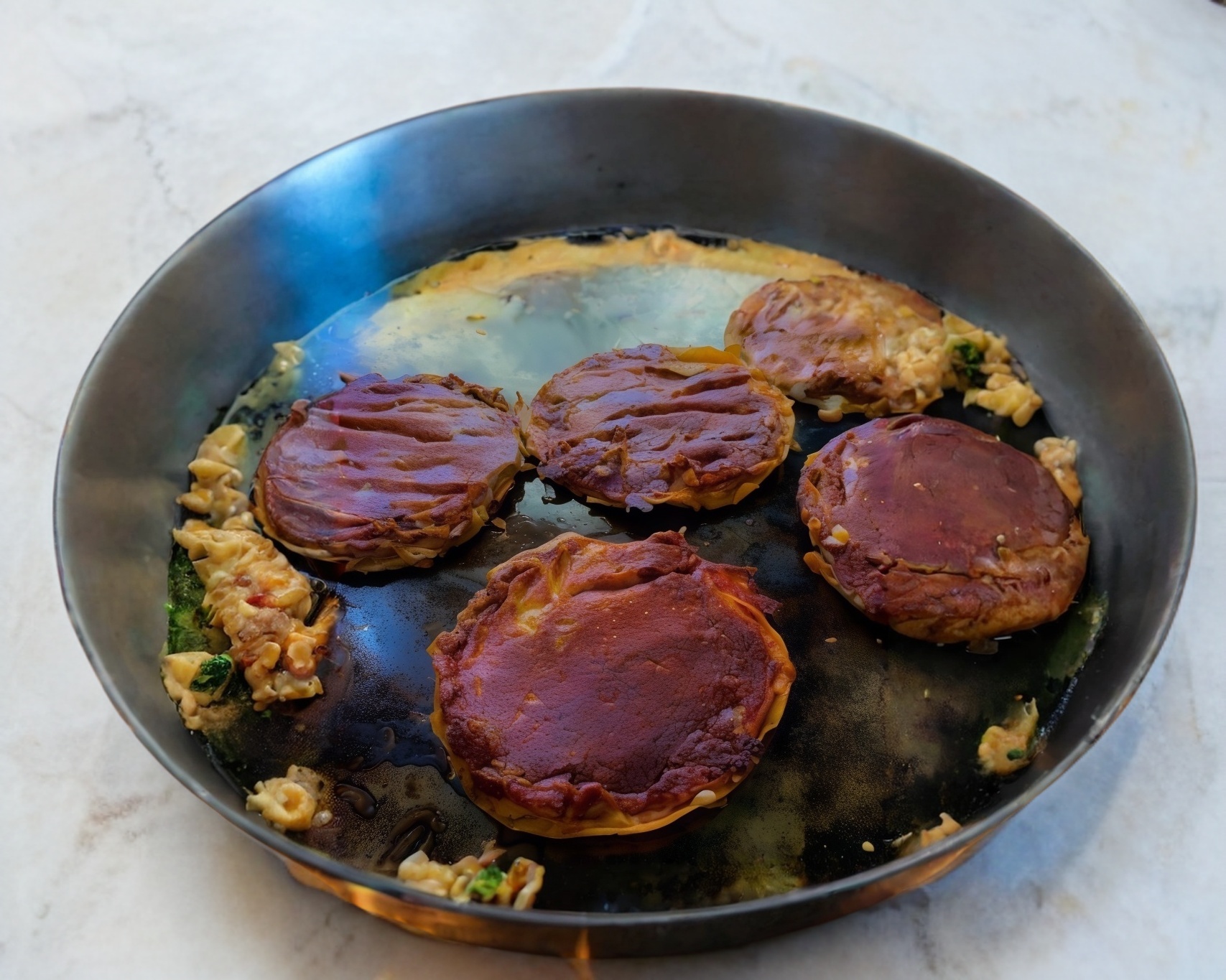 1pzs-Lleva doble tortilla, carne en el centro, cubierta con una costra dorada de queso.