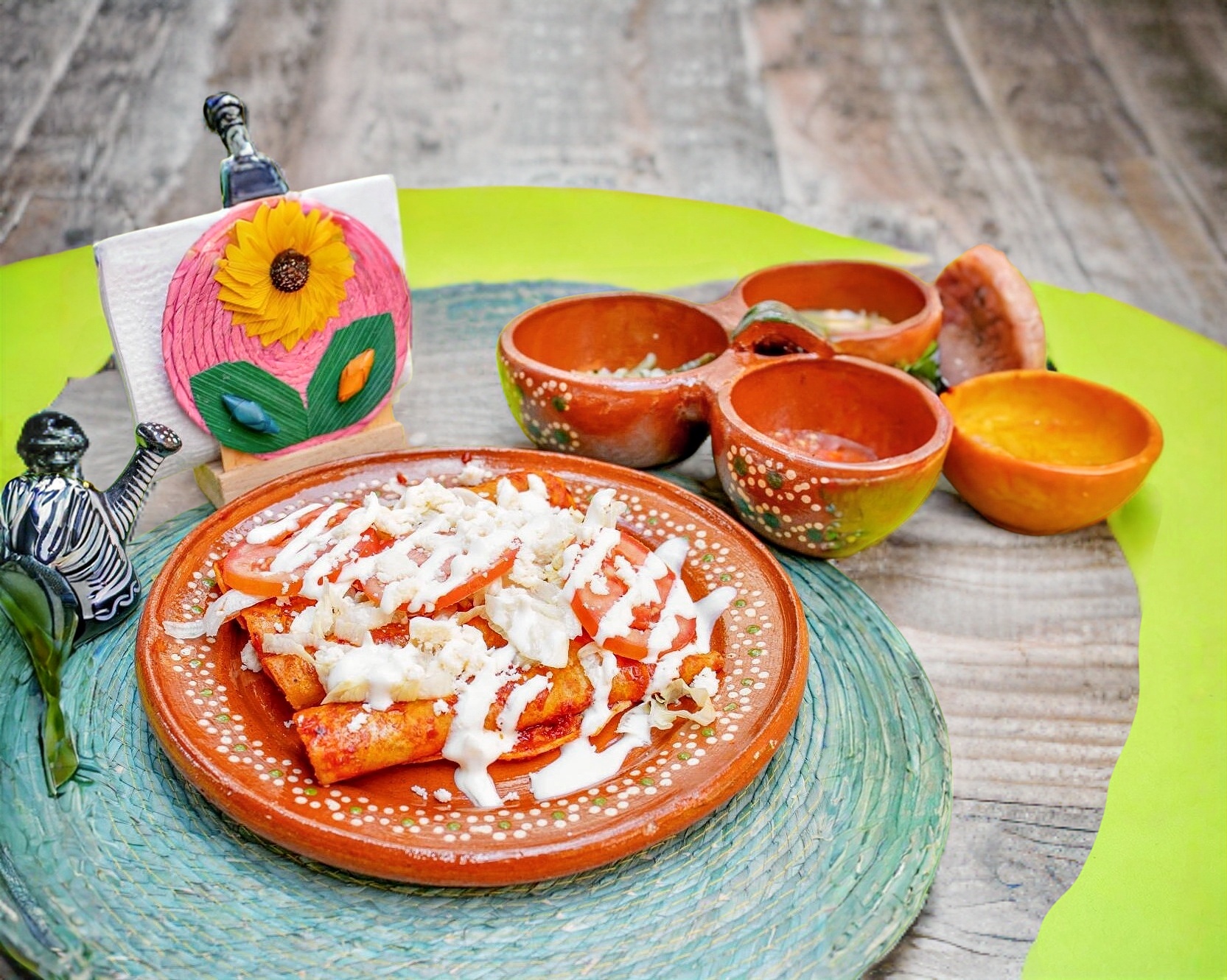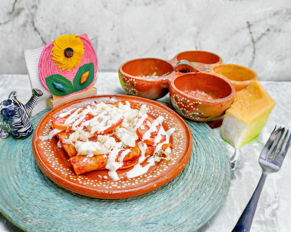 4 Pzas de tortillas suaves pasadas en aceite, rellenas de pollo o queso, bañadas con salsa de tomate, cubiertas de queso y crema, acompañadas de ensalada.