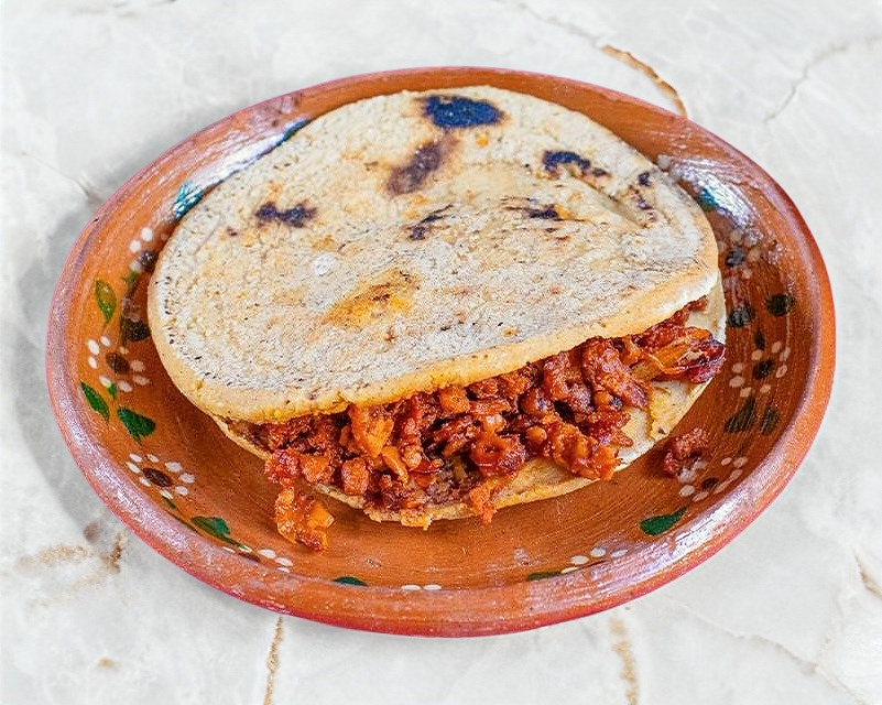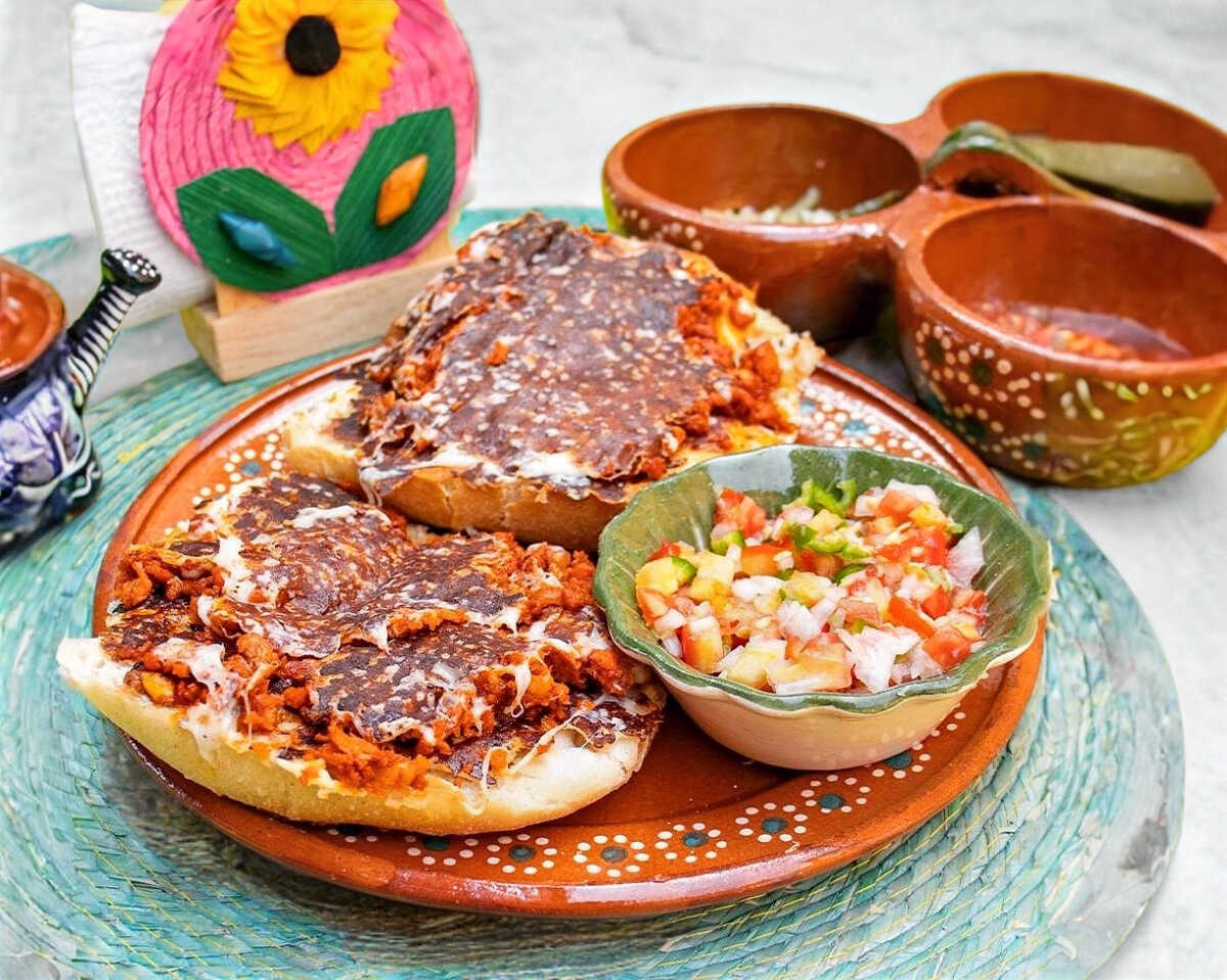 2 Pzas de bolillo calientito con frijoles refritos, guiso a elegir o chilaquiles, cubierto de queso manchego y salsa pico de gallo.