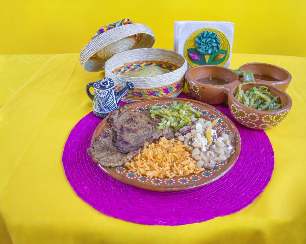 Chilaquiles rojos o verdes, acompañados con frijoles refritos y asada.