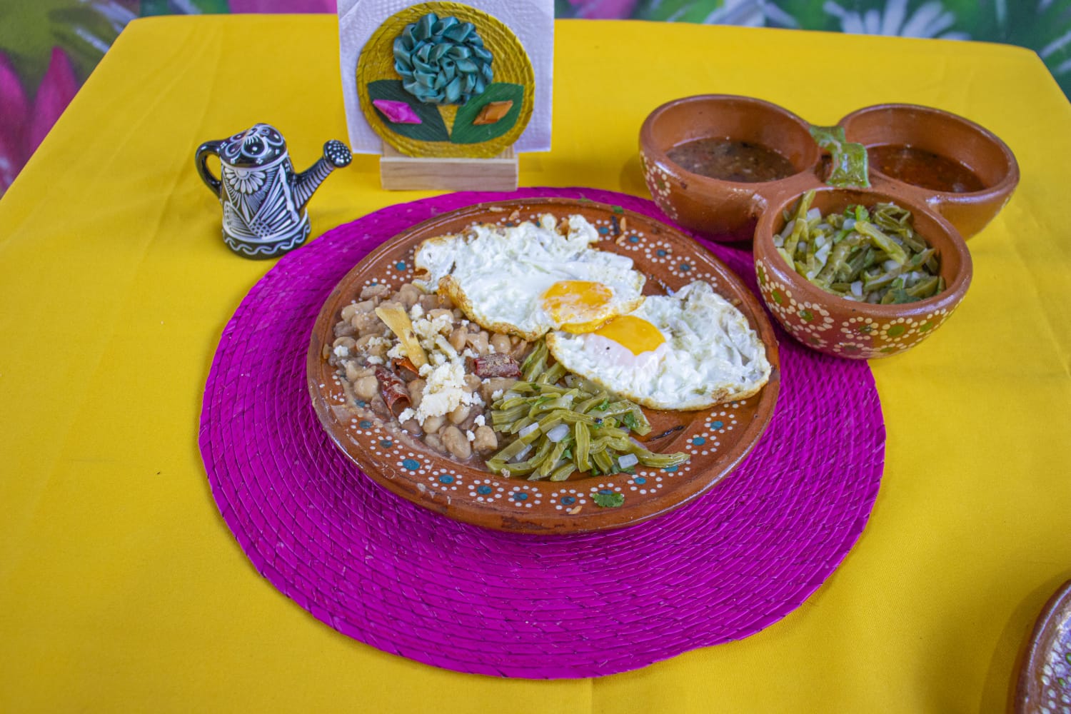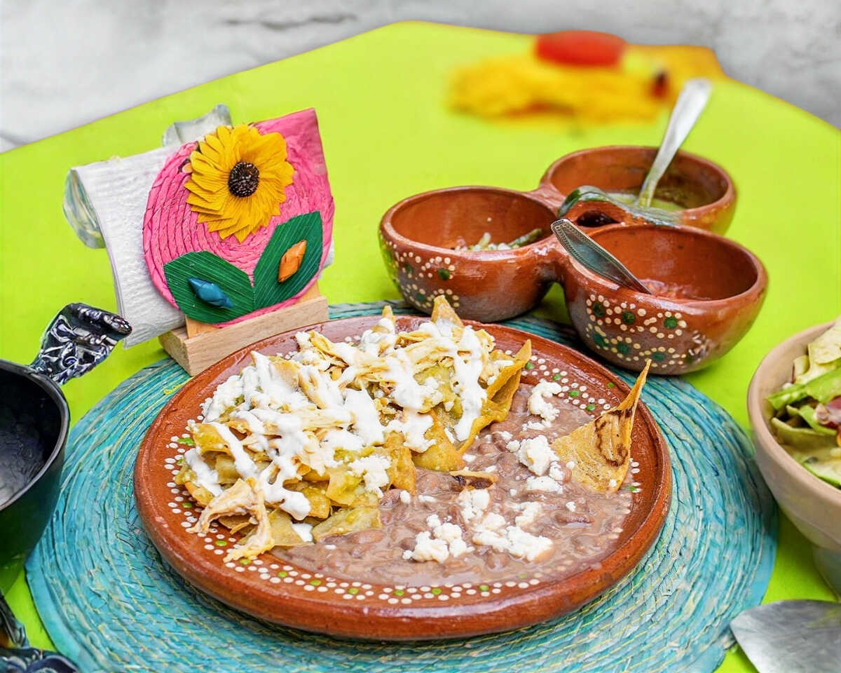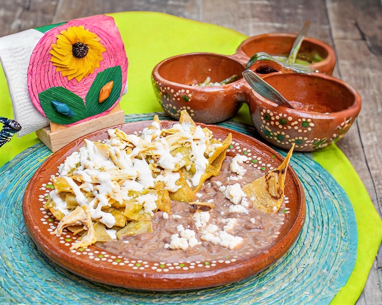 Chilaquiles rojos o verdes, acompañados con frijoles refritos y huevos al gusto (Estrellado o revuletos).