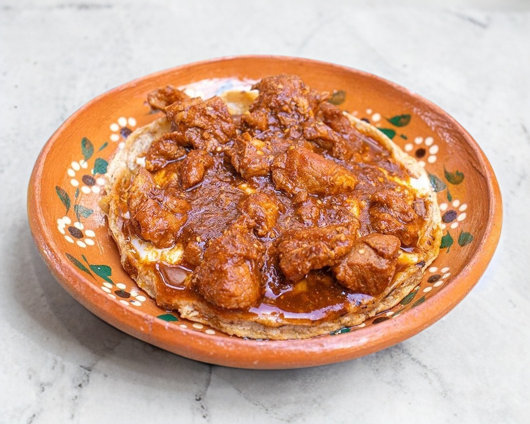 4 Pzas de tortillas suaves, pasadas en aceite, rellenas de pollo, bañadas en mole casero, cubiertas de queso, acompañadas de ensalada.