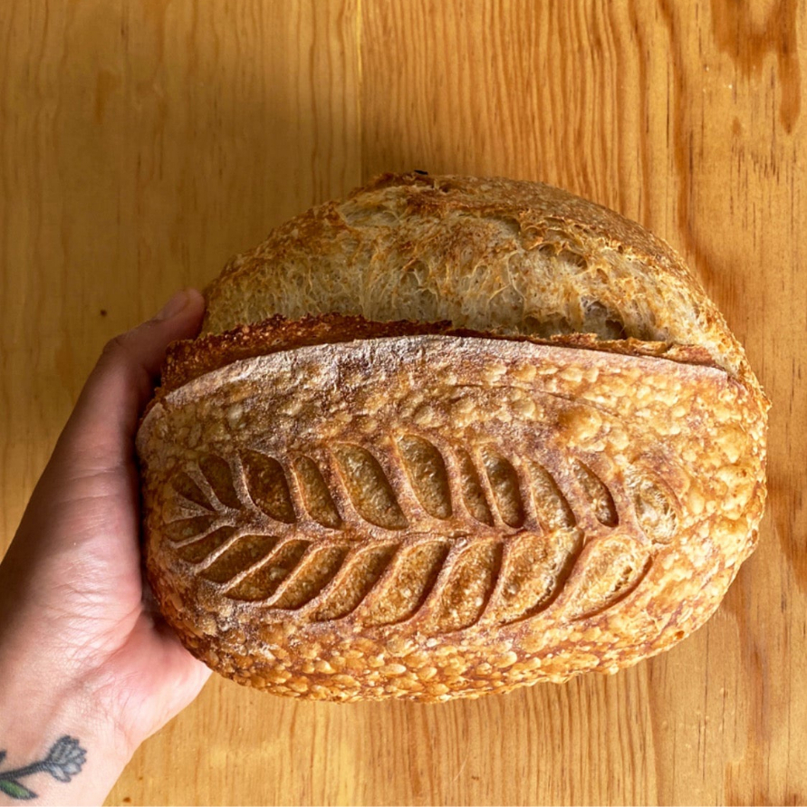 Corteza crujiente, miga húmeda y alveolada. Sabor complejo por su fermentación larga. Un básico elegante.