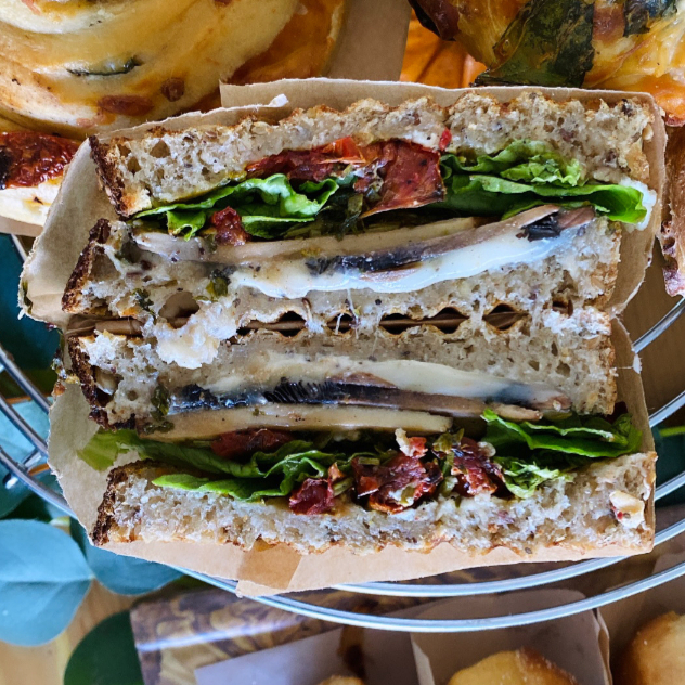Pan de molde con semillas, quesos mozzarella + Monterrey Jack, portobello, mostaza fermentada, chimichurri, jitomate rostizado y lechuga.