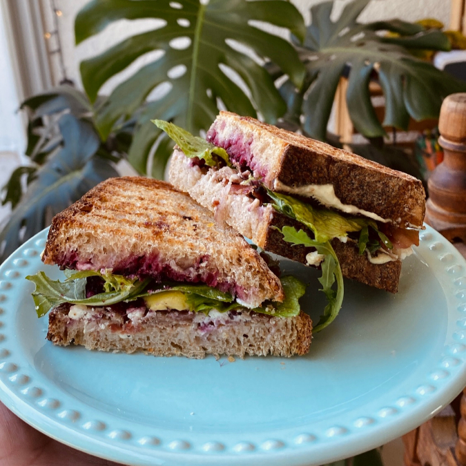 Hogaza, mayonesa de kéfir, mozzarella, queso Monterrey Jack, lechugas, miel y mostaza fermentada.