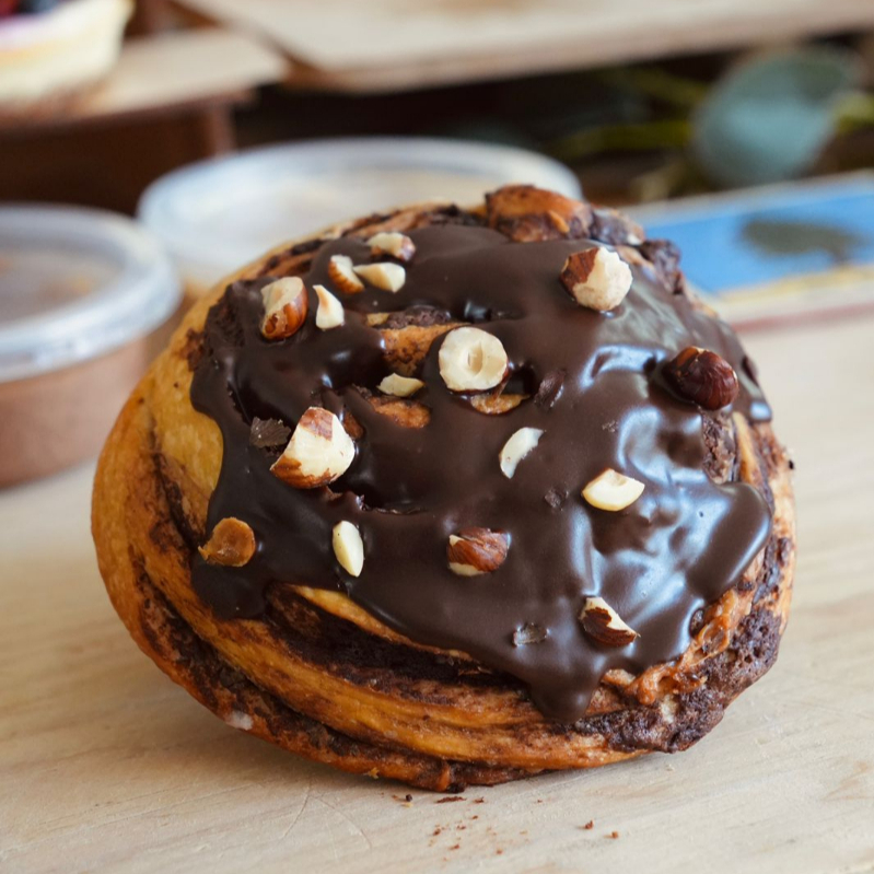 Nuestro Best Seller. Trenza de masa enriquecida con avellanas tostadas, crema de avellanas, chocolate oscuro, ganache y más avellanas.