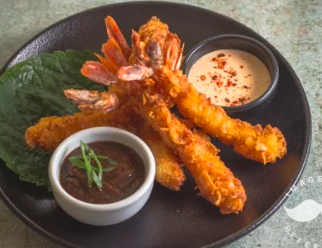 Camarón empanizado y queso cubierto con ajonjolí servido con tampico