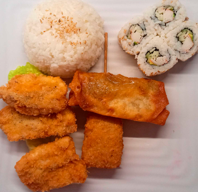 Empanada de carne y verdura harumaki*1 + brocheta de queso kushiage*1 + Filete de pescado empanizado Sakana Furai*1 + arroz blanco gohan*1 + 4 piezas sushi california de cangrejo*1 + Gelatina de café*1